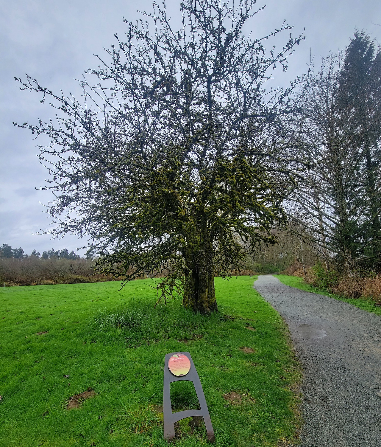 걷던 중, 오래된 사과나무 하나가 눈에 들어왔다. 공원에서는 보기 드문 작은 안내판이 붙어 있었다. 1900년에 심어진 나무라고 했다. 햇수로 125년을 살아온 나무. 줄기 전체는 짙은 이끼로 덮여 있었고, 세월의 주름을 꾹꾹 눌러 담은 듯한 모습에 우리는 한참을 바라보았다.