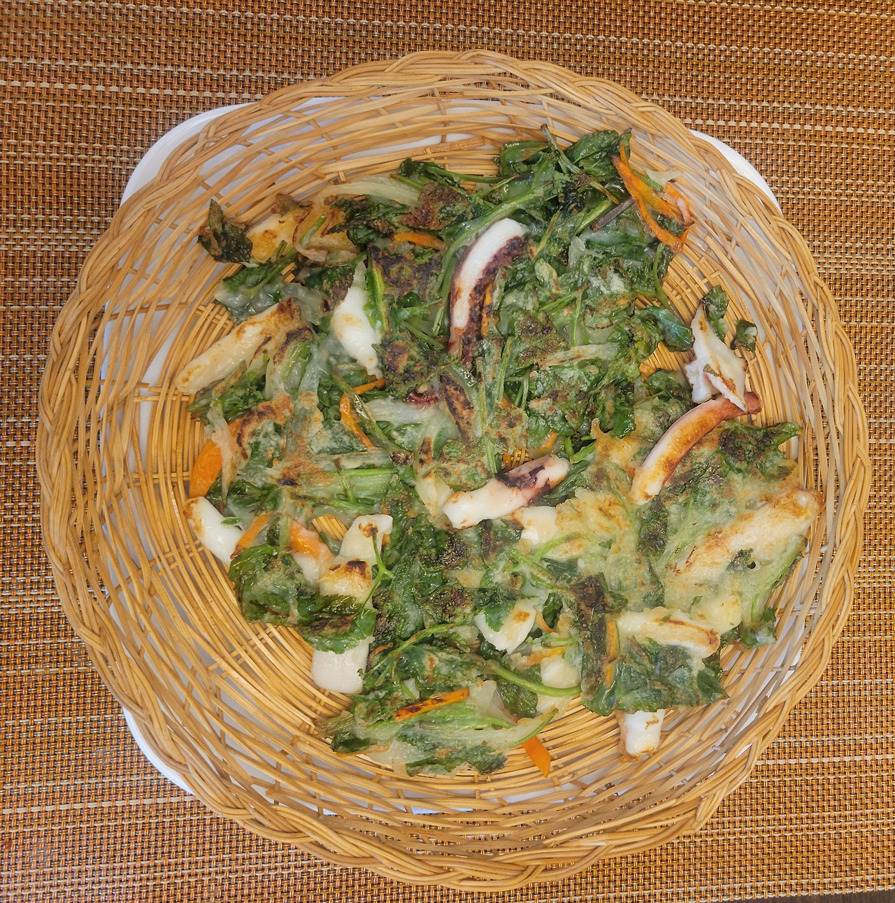 우리 부부는 먹는 양이 많지 않아 세 판만 부쳤다. 산나물의 비중을 전체 재료의 약 70%로 맞췄지만, 막상 접시에 올려 보니 오징어가 더 눈에 띄었다. 젓가락도 자연스럽게 오징어 쪽으로 향했다. 산나물은 파전처럼 넓게 퍼지며 푸른빛을 띠었고, 열을 받으며 얇고 투명한 층을 이뤘다.