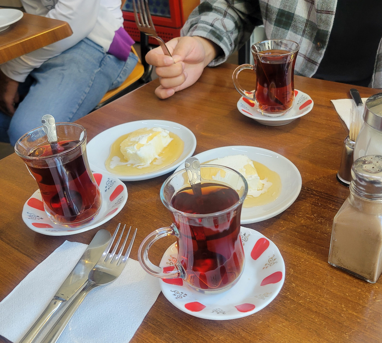 잠시 후, 따뜻한 빵과 함께 하얀 클로티드 크림, 윤기 흐르는 꿀, 그리고 커피 대신 진한 홍차가 테이블 위에 놓였다. 주인아저씨가 능숙한 손놀림으로 빵 위에 꿀을 듬뿍 뿌려주며 환하게 웃었다. 그의 몸짓엔 익숙함과 정겨움이 묻어 있었다.