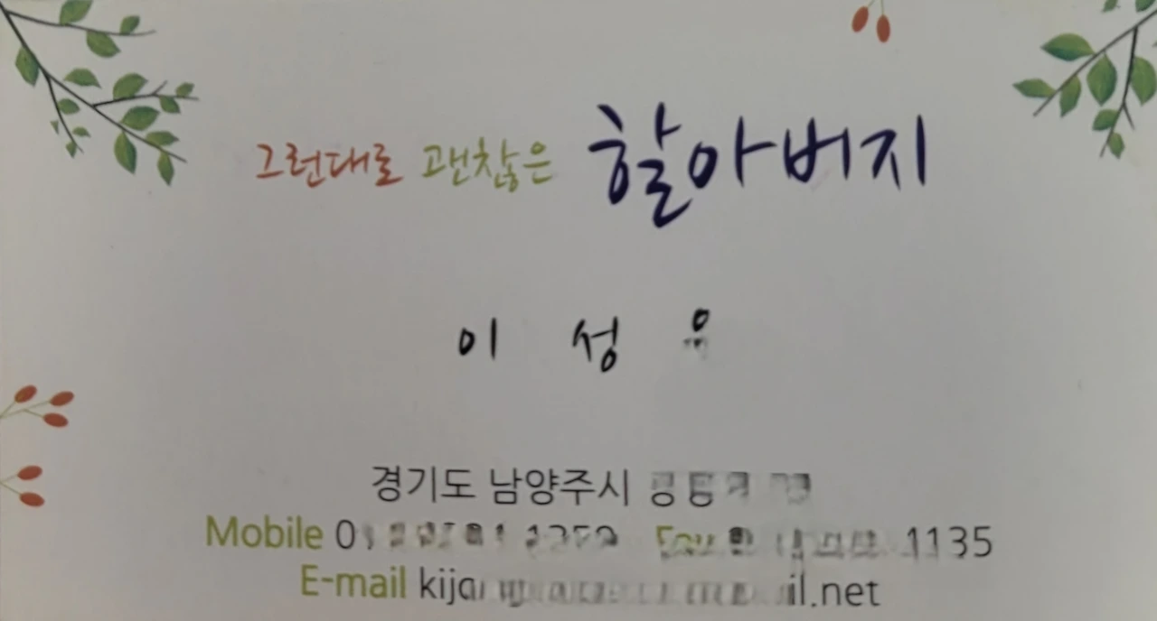 명함은 첫인상부터 특별했다. 맨 위에는 ‘그런대로 괜찮은’이라는 붉은색과 연두색의 감각적인 문구가 인쇄되어 있었고,그 아래 진한 보랏빛 글씨로 ‘할아버지’라는 단어가 큼직하게 쓰여 있었다.중앙에는 어르신의 성함이, 하단에는 연락처와 이메일이 깔끔히 적혀 있었다.명함 양 옆에는 잎사귀와 열매 같은 작은 장식이 들어가 있어,마치 누군가의 삶의 여백에 조용히 피어난 들꽃 같았다.