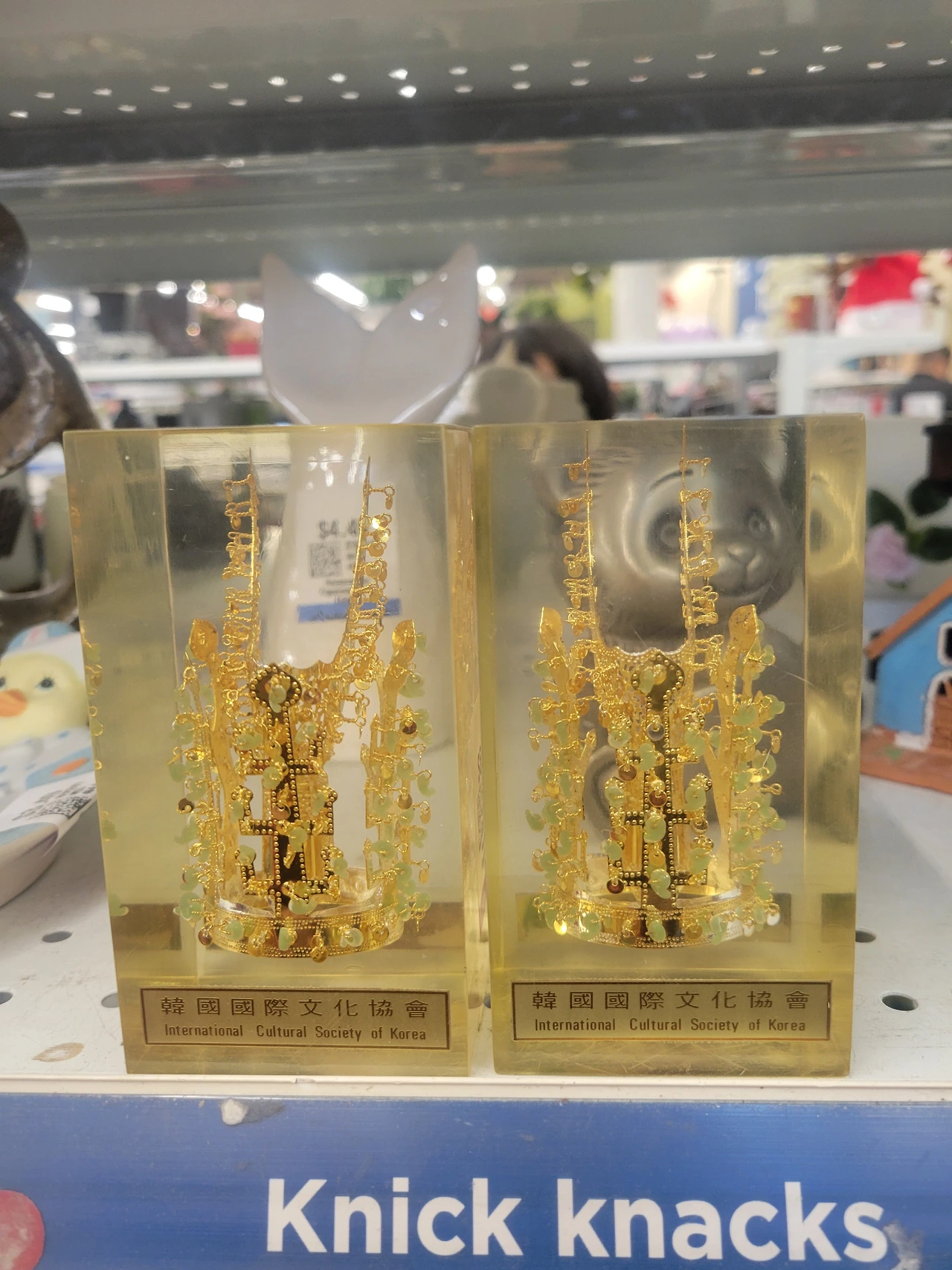 얼마 전, 경주에서 열린 APEC 정상회의에서 한국 대통령이 미국 대통령에게 신라 금관 모형을 선물했다는 뉴스를 본 적이 있다. 순금으로 제작된 근사한 작품이 세계의 시선을 받으며 주목을 받았다. 반면 오늘 내가 본 금관은 액체 아크릴 속에 작은 모습으로 박제되듯 자리하고 있었다. 하나는 세계의 중심으로 향했고, 하나는 중고매장을 돌아다니다 나에게 우연히 발견되었다. 두 금관의 길이 너무 달라 오히려 묘한 재미가 있었다.