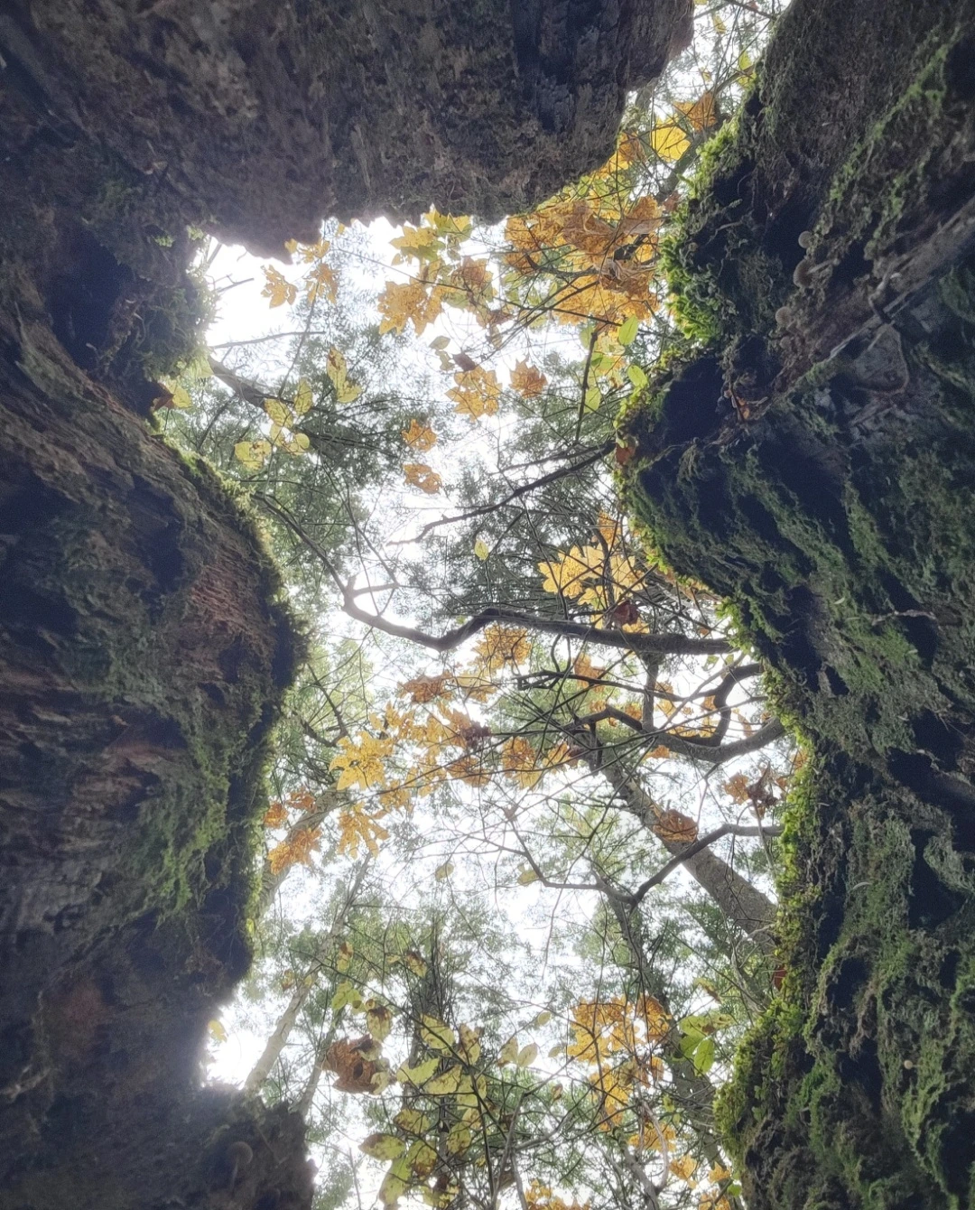 산책로 한쪽에는 수백 년 동안 이곳을 지켜온 나무들이 즐비하다. 그중에는 세월의 무게를 이기지 못하고 고사하여 거대한 밑동만 남은 고목들도 흔하게 볼 수 있는 산책로 풍경이기도 하다. 성인 두 사람이 팔을 벌려도 감싸 안기에 턱없이 부족할 만큼 거대한 크기다. 겉과는 달리 속이 비어버린 그 모습은 마치 숲 속에 작은 나무 울타리를 쳐놓은 것 같기도 하고, 무언가를 간절히 품고 있는 그릇처럼 때론 작아 보이기도 한다. 평소 그 어두운 공간 속에 무엇이 담겨 있을지 궁금했던 나는, 오늘 카메라를 든 손을 나무속 깊숙이 밀어 넣었다. 렌즈를 하늘로 향하고 셔터를 눌렀다.