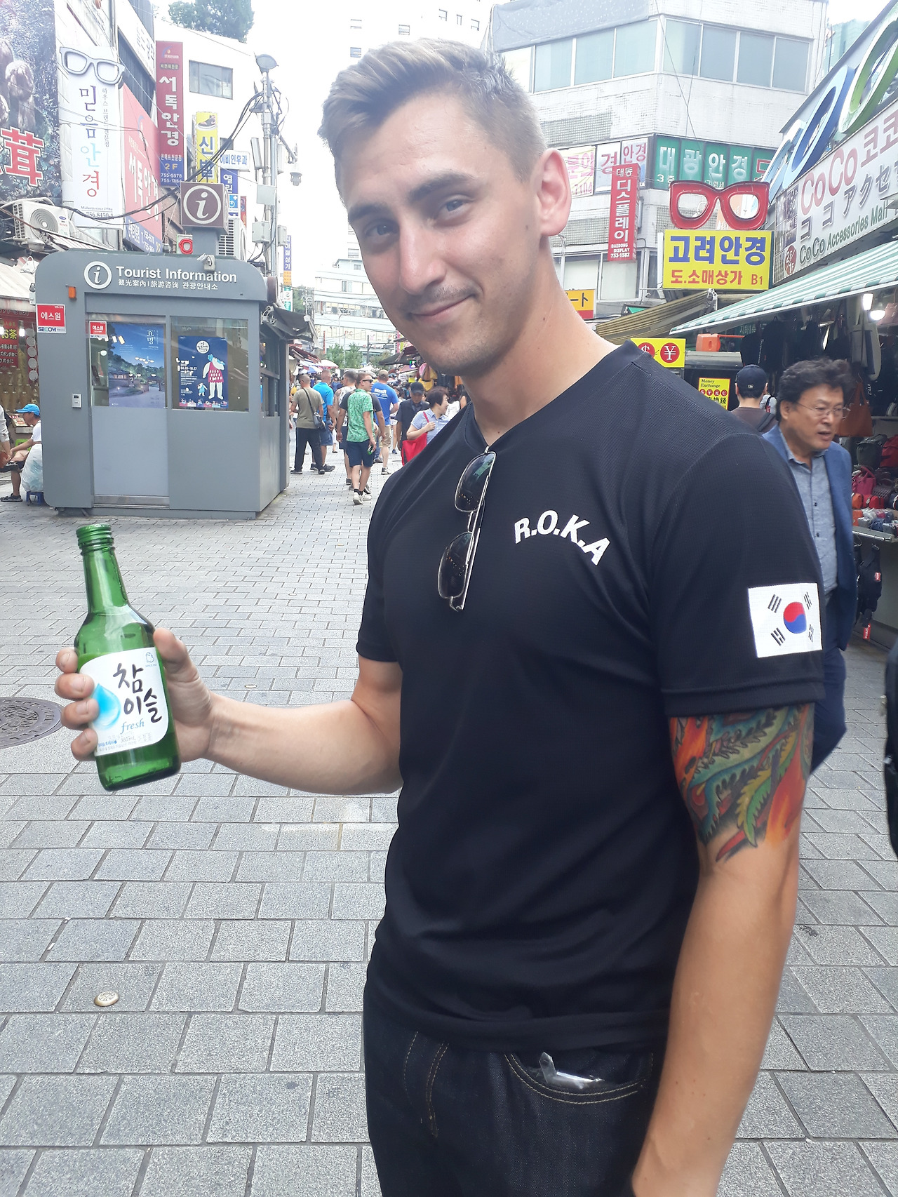 한잔도 채 마시지 못하고 술병을 닫았다. 한국 국기가 새겨진 옷과 소주를 들고 있는 외국인,