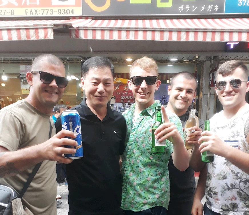 시장거리 풍경은 커피나 음료수를 마셔가면서 구경거리를 찾는 일반적인 모습과는 달리 이색적인 젊은 관광객을 만날 수 있었다. 각자의 손에는 소주와 전통방식의 술 백세주까지도들고 있었다. 그중 한 친구만유일하게 맥주를 들고 나왔다. 관광객은 새로운 이국의 환경이 신기함과호기심까지발동한 것 같다.