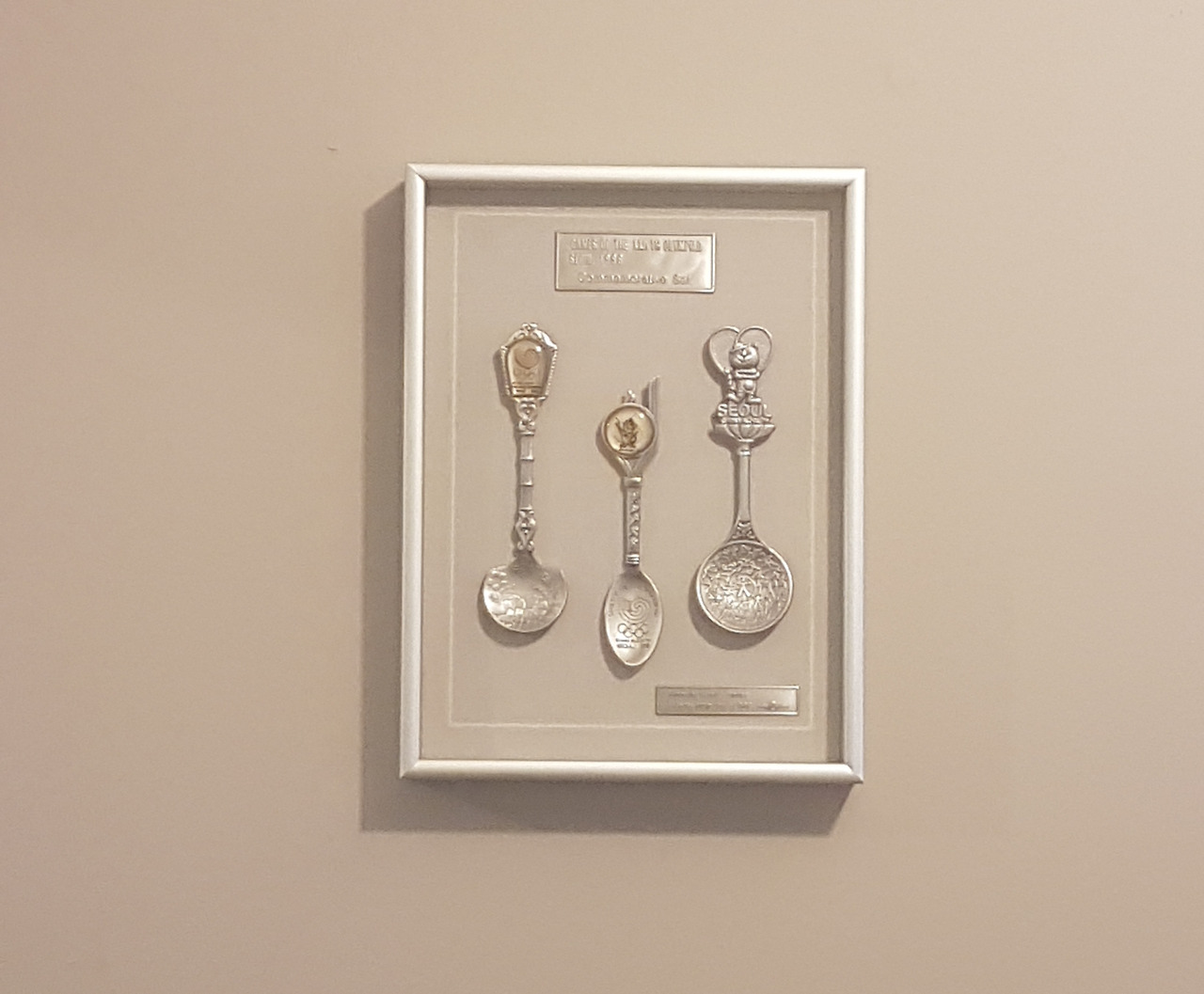 진열대 앞에서 익히 낯익은 반가운 물건을 만났다. 88 올림픽 기념품인 티스푼 세트이다. 기념품은 이미 33년이라는 건장한 성인의 나이를 맞이하였다. 그럼에도 불구하고 사용감이 전혀 없어 보인다. 횡재한 기분으로 2불도 안 되는 가격을 재빠르게 지불하고 쇼핑카트에 담아 집으로 돌아왔다. 현관문을 열면 가장 먼저 눈에 띌 수 있는 정면 부분에 올림픽 기념 티스푼 세트 액자를 걸어 두었다.
