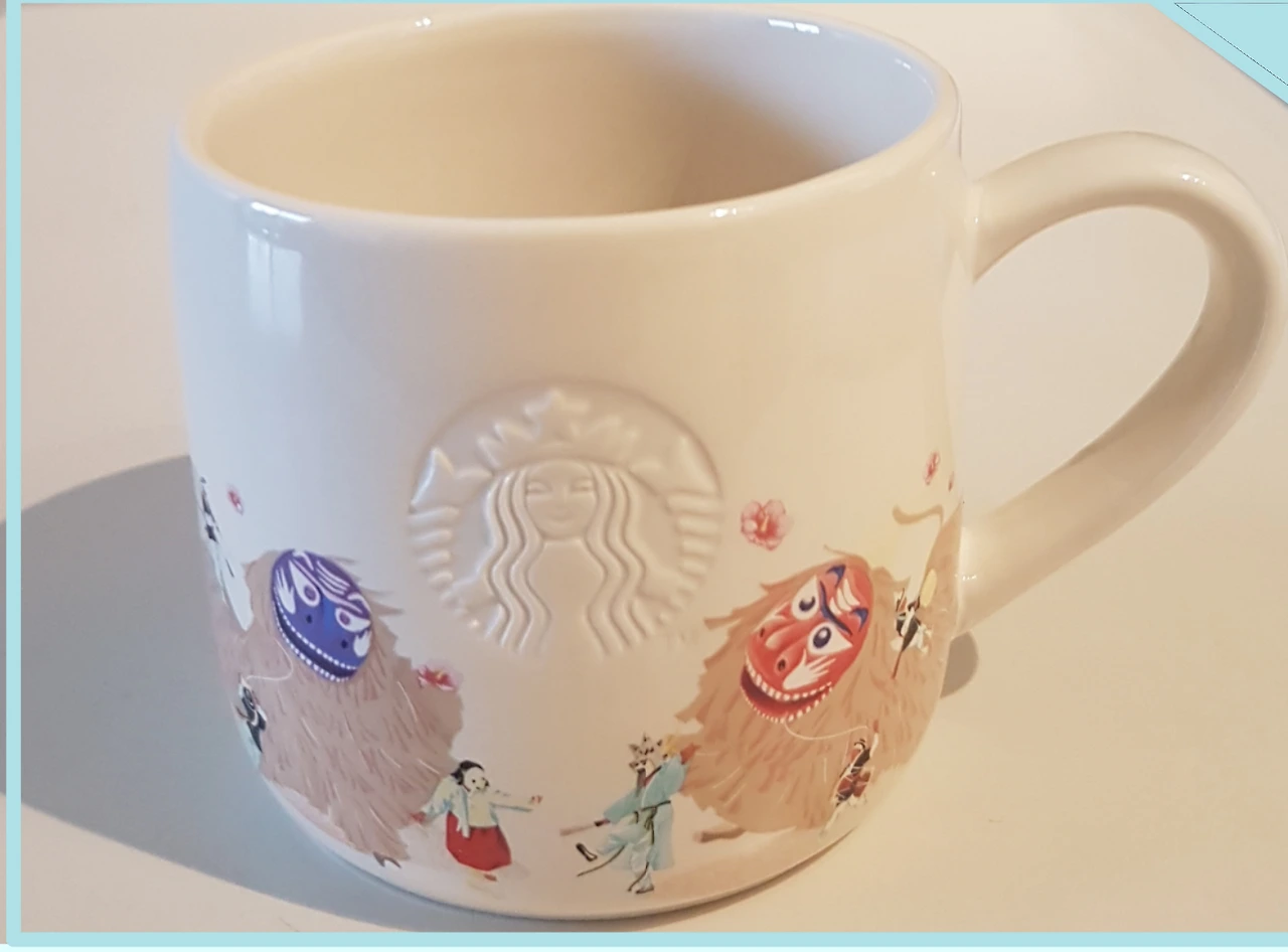 아내가 내 마음을 읽은 것일까, 느닷없이 찬장 깊숙한 곳에서 머그잔 하나를 꺼내어 왔다. 머그컵 바닥 부분에스티커가 붙어 있는 상태를 보아 한 번도 사용하지 않은 컵이다. 앞쪽 부분에는 스타벅스를 상징하는여신의 모습이 뒤쪽 부분엔 KOREA라는 문구와 함께 북청사자놀음 캐릭터가 새겨져있었다. 아내가 건네준 머그컵은 예전한국 방문 당시 지인으로부터 받은 선물이라고 한다.
