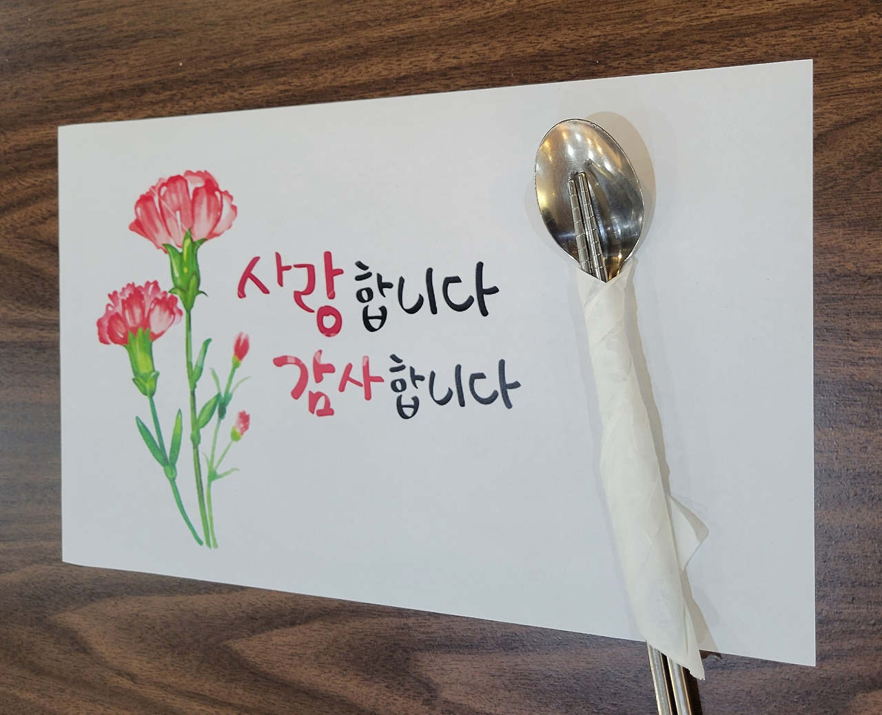 식탁위에는 식탁보 대신 사랑합니다.감사합니다라는 은혜의 뜻이 담긴 문구가 펼쳐져 있다.