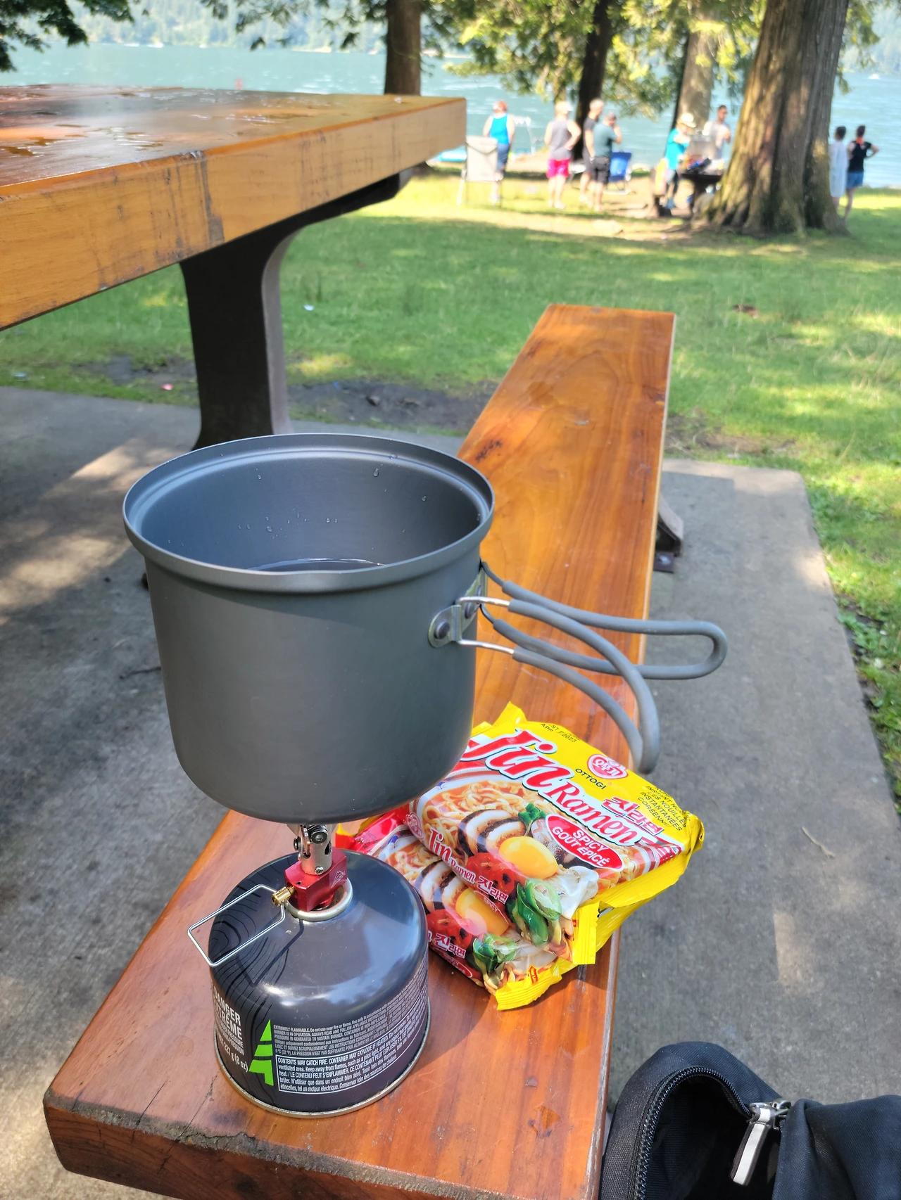 하루 당일치기 여행에는 대충 손쉽게 조리할 수 있고 가볍게 먹을 수 있는 라면으로 준비했다. 여행지에서 특별한 음식을 사 먹을 수도 있겠지만 한국과 달리 도시를 벗어나면 음식점 찾기란 쉽지 않은 여건을 가지고 있다. 때문에, 간단한 먹거리 정도는 준비해 가야 하는 것이 캐나다 여행에 필수 조건과도 같다. 라면은 간단한 식사 대용이기도 하지만 야외에서 먹는 맛은 감히 표현할 수 없으리만큼 특별식으로변신했다.