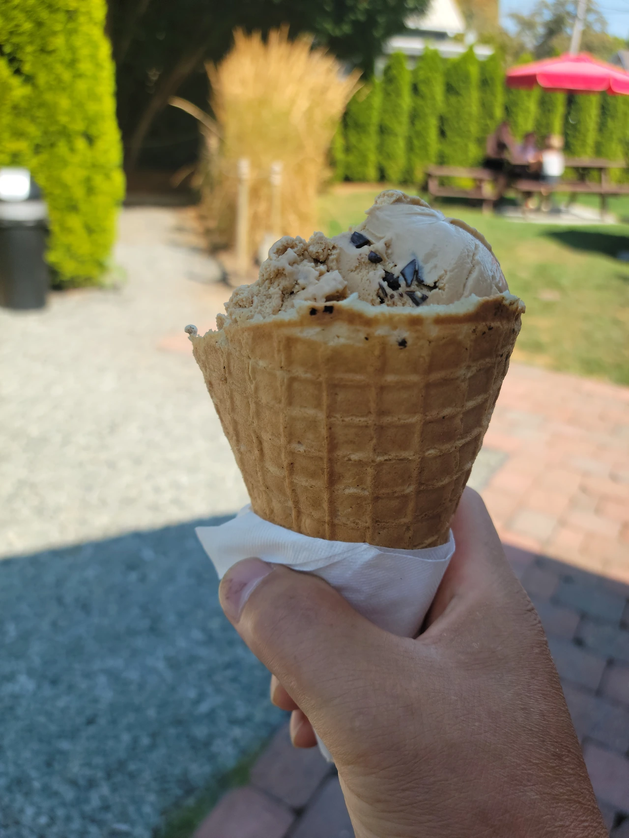 아이스크림의 맛이 특별할 것이라는 생각은 빗나가지 않았다. 기존의 아이스크림과는 차별화된 형태를 가지고 있었다. 일반적인 아이스크림에 사용되는 콘이 아니었다. 갓 구워낸 와플이 아이스크림 콘으로 탈변신했다. 와플은 아이스크림 가격과는 별도의 추가 요금 65 센트를 지불했다. 아이스크림 가격 대비 와플 가격은 생각 이외로 저렴했다. 아이스크림맛 자체는 시중에서 판매되는 맛과 별반 차이를 느끼지 못했다. 물론 나만 느끼는 맛 감의 차이일수도 있다. 하지만, 와플과 함께 어우러진 최종적인 맛은 시중 아이스크림과는 비교가 안되었다. 더구나 야외에서 먹는 분위기가 아이스크림에 덥혀져 한층 더 특별한 맛의 여운을 남겨갔다.
