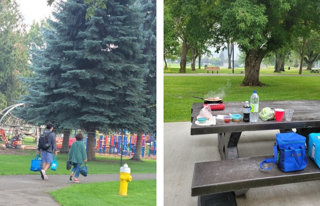아침 일찍 집에서 출발한 탓에 목적지인 캠 롭스까지는 오전 11시도 안 되어 도착을 했다. 목적지에 도착하여 점심으로 공원에서 바비큐를 해 먹기로 했다. 우선 불 사용 가능한 공원을 찾다가 도심 인근에 있는 Riverside park라는 공원을 찾을 수가 있었다. 공원에 도착한 순간 왠지 낯설지가 않았다. 예전에 장거리 여행 도중에 고속도로 톨케이트를 빠져나와 휴식 겸 잠시 들렸던 공원이라는 기억을 찾아냈다. 공원 일부는 대내적인 보수작업을 하고 있었다. 공사로 인해 공원의 아늑함보다는 왠지 부산하고 불안정한 느낌이 먼저 다가섰다. 공사장 부분에서 조금 떨어져 있는 쪽으로 걷다 보니 피크닉 테이블이 보였다.