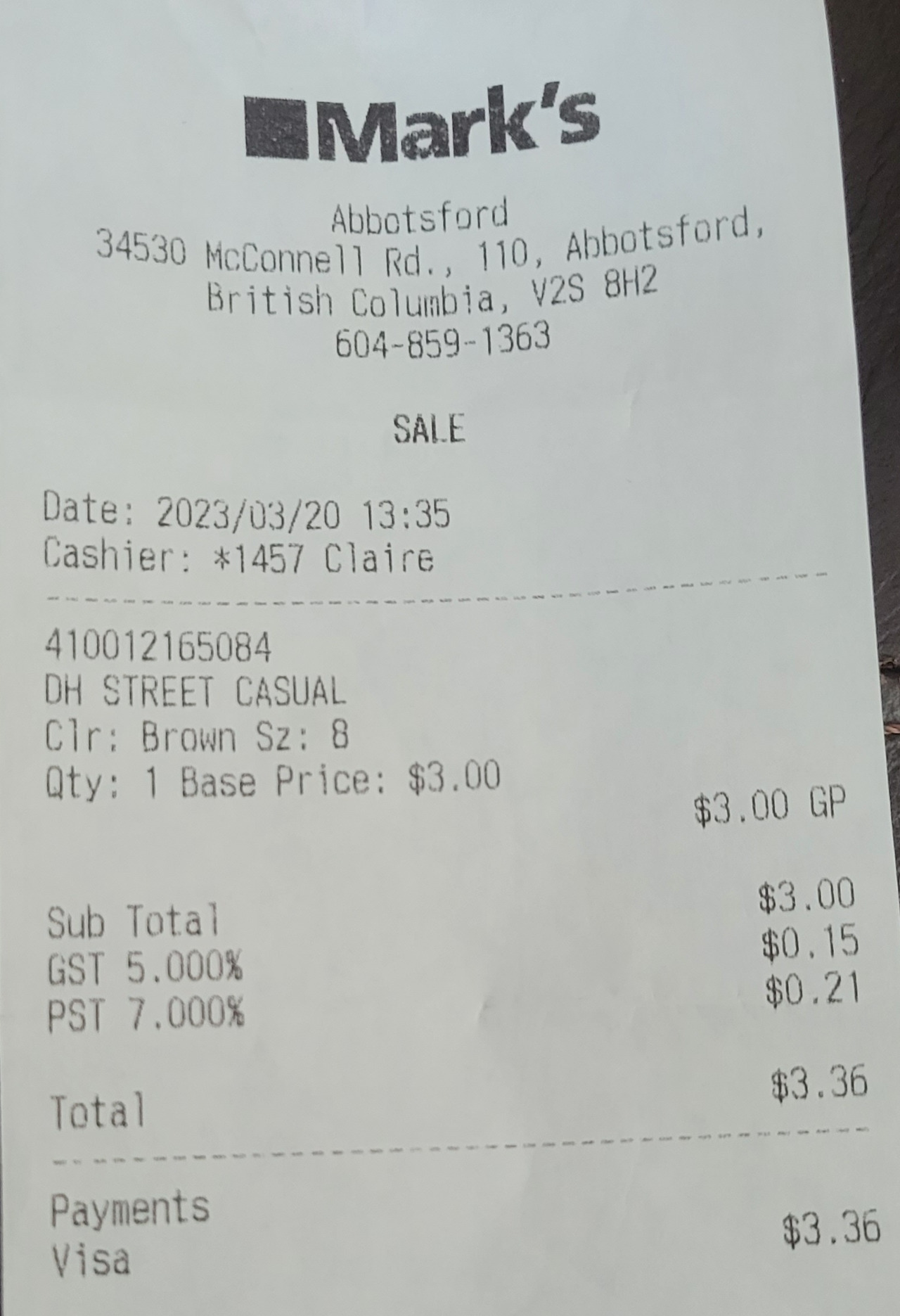 3불에 계산된 신발 가격 명세표이다. 세금 합산하여 결재금액은 3.36불이다.