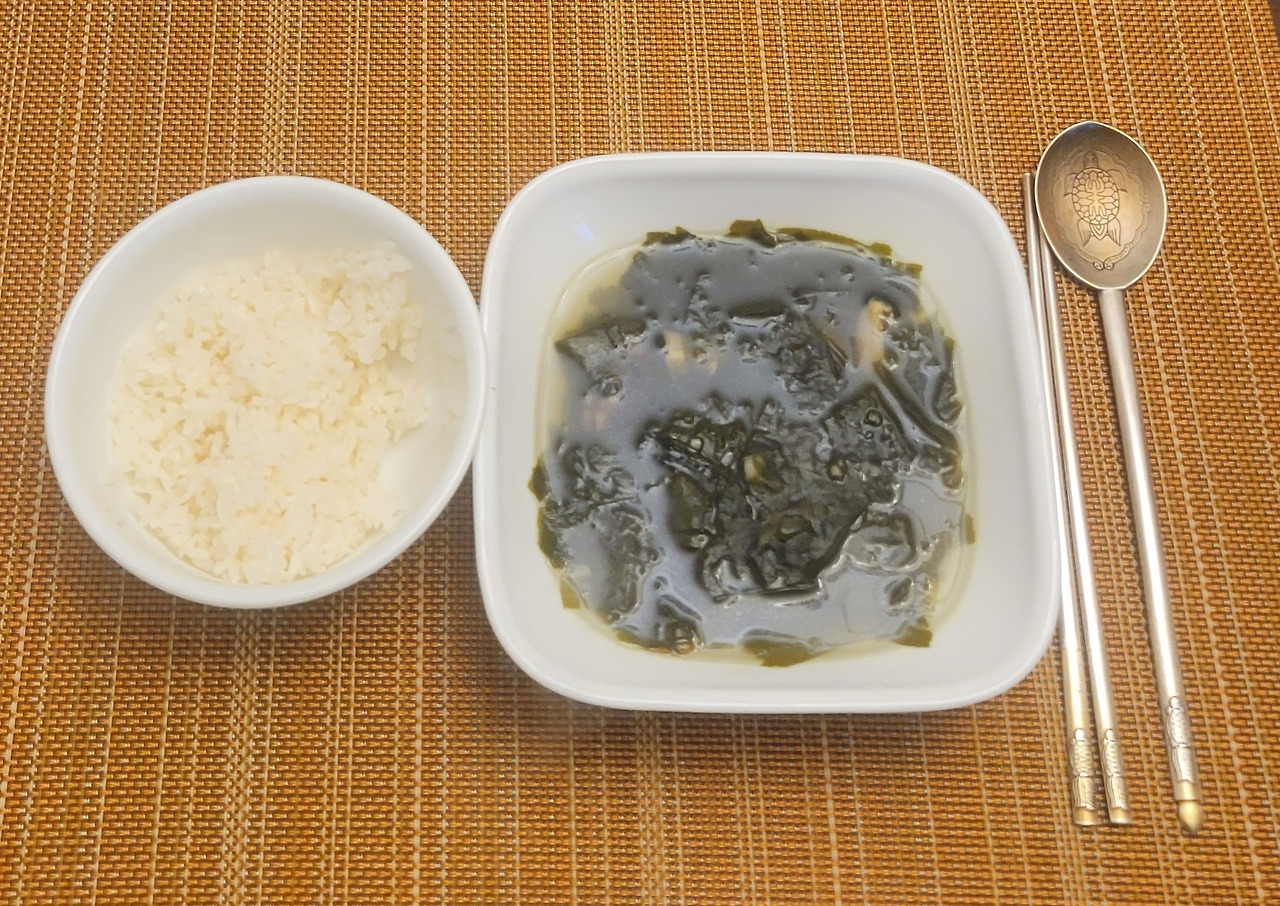 잘게 자른 미역을 소금 반스푼과 함께 물에 15분가량 담가 두었다가 건져내어 손으로 짜내어 물기를 없앤 후, 끓일 냄비에 담아 놓았다. 그 위에 다진 마늘 한 스푼, 액젓 두 스푼, 진간장 한 스푼, 참기름 한 스푼을 넣고 볶다가 적당량의 물을 붓고 센 물에서 어느 정도 끓이다가 마지막 중불에서몇 분 끓여 내는 것으로미역국이 완성되었다. 미역국의 맛을 보니 다소 싱거운 느낌이 들었다. 맛소금으로 간을 맞추는 것을 끝으로 미역국이 완성되었다. 맛은 손색없이 훌륭했다.