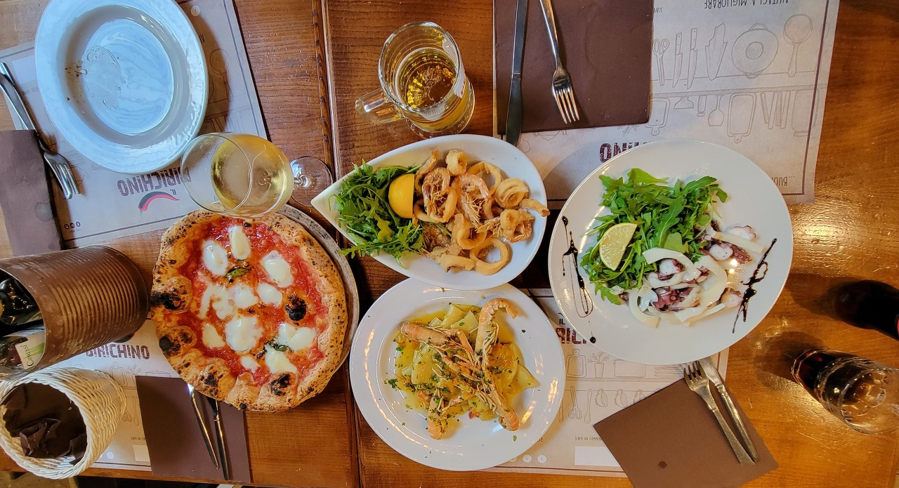 주문한 음식이 나왔다. 피자는 공동으로 맛을 보기 위해 한판을 주문하고 각자 취향에 맞는 메인 음식을 주문했다. 주문은 아들에게 전부를 위임하였다. 오징어 튀김과 새우튀김. 삶은 문어가 피자와 함께 식탁 위에 올라왔다. 아내는 음료로 와인 나는 생맥주를 선택하고 아들은 콜라를 주문했다. 이탈리아 식당을 가면 주로 와인과 맥주가 준비되어 있다. 주문한 음식은 한국에서도 흔히 먹을 수 있는 음식이지만, 음식에 전해지는 소스와 조리과정 중에서 얻어지는 또 다른 특유의 맛이 있다. 사실 화덕에 구워낸 피자를 한국에서도 먹어본 기억은 있지만 맛을 기억해 내지는 못했지만, 나폴리아에서 먹는 피자의 맛은 입에 달라붙는 듯한 말로 형용할 수 없는 맛의 질감이 있다. 느낌이 또한 맛을 더 보태었다.