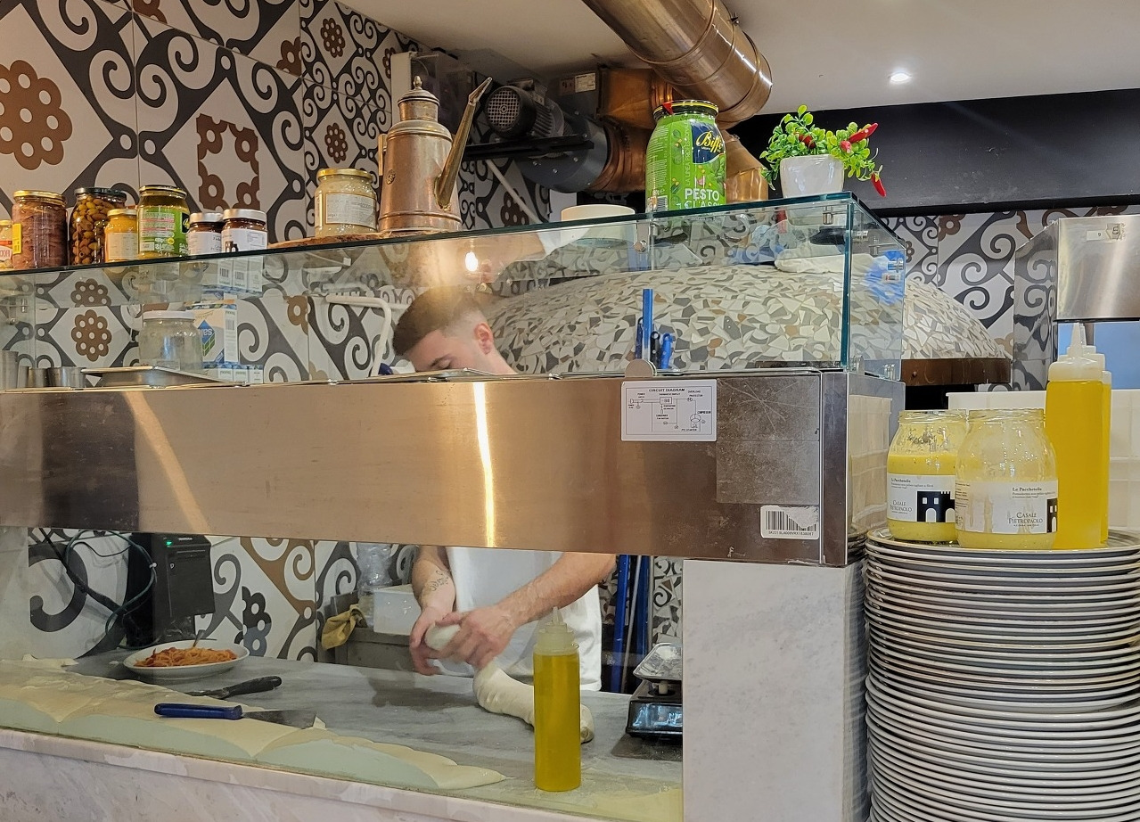 나폴리에 맛집을 검색해서 들어갔다. 리뷰와 평점이 좋은 집을 선택해서들어갔다. 식당에는 이른 점심시간이라 우리가 첫 손님이 되었다. 피자의 본고장답게 식당 출입문을 들어서는 순간, 피자의 본고장답게 화덕이 먼저 눈에 들어왔다. 화덕 옆에는 피자를 구워 내기 위해서 반죽을 하고 있었다. 피자의 본고장에서 내부 사진 공개가 영업 비밀이 될 수도 있다는 생각에서 미리 주인의 양해를 구하고 사진 촬영을 했다.