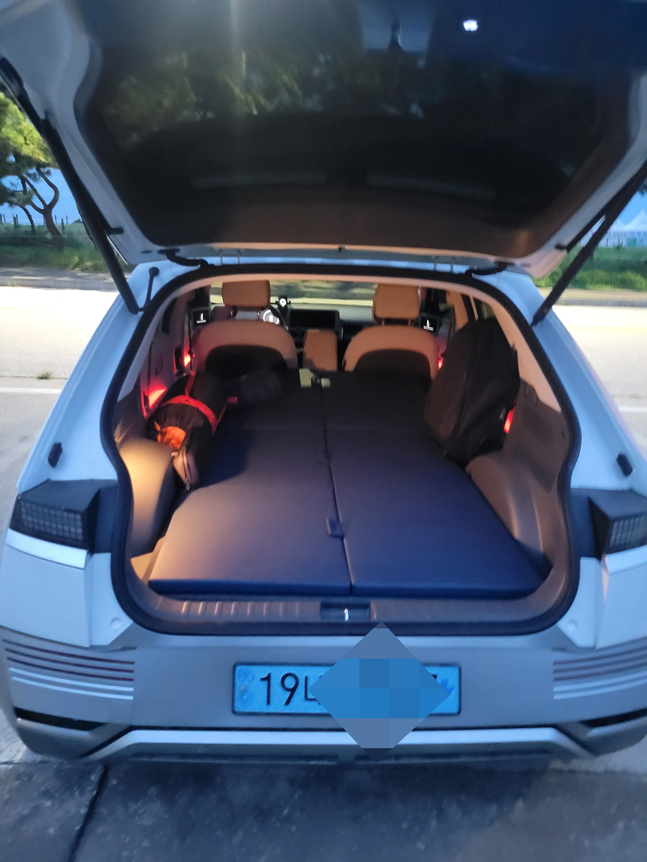 백사장과 마주하고길게 주차장이 준비되어 있다. 한눈으로 가늠할 수 있을 정도로제한적인 캠핑카가 몇 대가 주차장에서 휴가를 즐기고 있는 것이 눈에 들어온다. 캠핑카가 몰려있는 쪽으로 이동 주차시켜 놓고 첫날 차박 일정에 돌입했다. 우선. 차 뒤좌석을 접어 그 위에 메트를 깔아 잠자리에 필요한 침실을 확보했다. 침실 공간이 생각보다 비교적 넓었다. 두 명 정도는 충분히자고도 남을 공간이다. 차 안에 누워 창가 쪽으로 시선을 돌렸다. 바다의 풍경이 한눈에 들어왔다. 바다를통째로 산 느낌이다. 그 느낌을 시작으로 차박 첫 여행이 시작되었다.