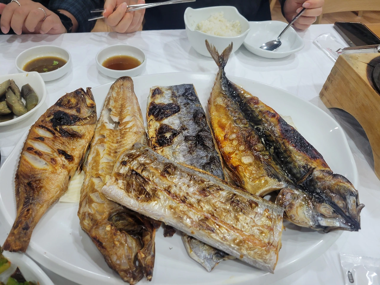 생선 구이를 먹기 위해서는 17분을 기다려 달라는 안내문구가식탁 모서리부분에 붙어있다. 돌솥밥을 짓어야 하고 구이를 구어야 하는 시간적 여유가 17분인 듯했다. 긴 기다림 끝에 노릇노릇한 보기에도 군침이 도는 맛깔스러운구이가 식탁 위에 올라왔다. 구워낸 생선이 한 바구니 기득이다. 보기만 해도 푸짐하고 입맛이 열리고 이미 배까지 부른 느낌이다. 메뉴는 5가지의 모둠 구이이다.