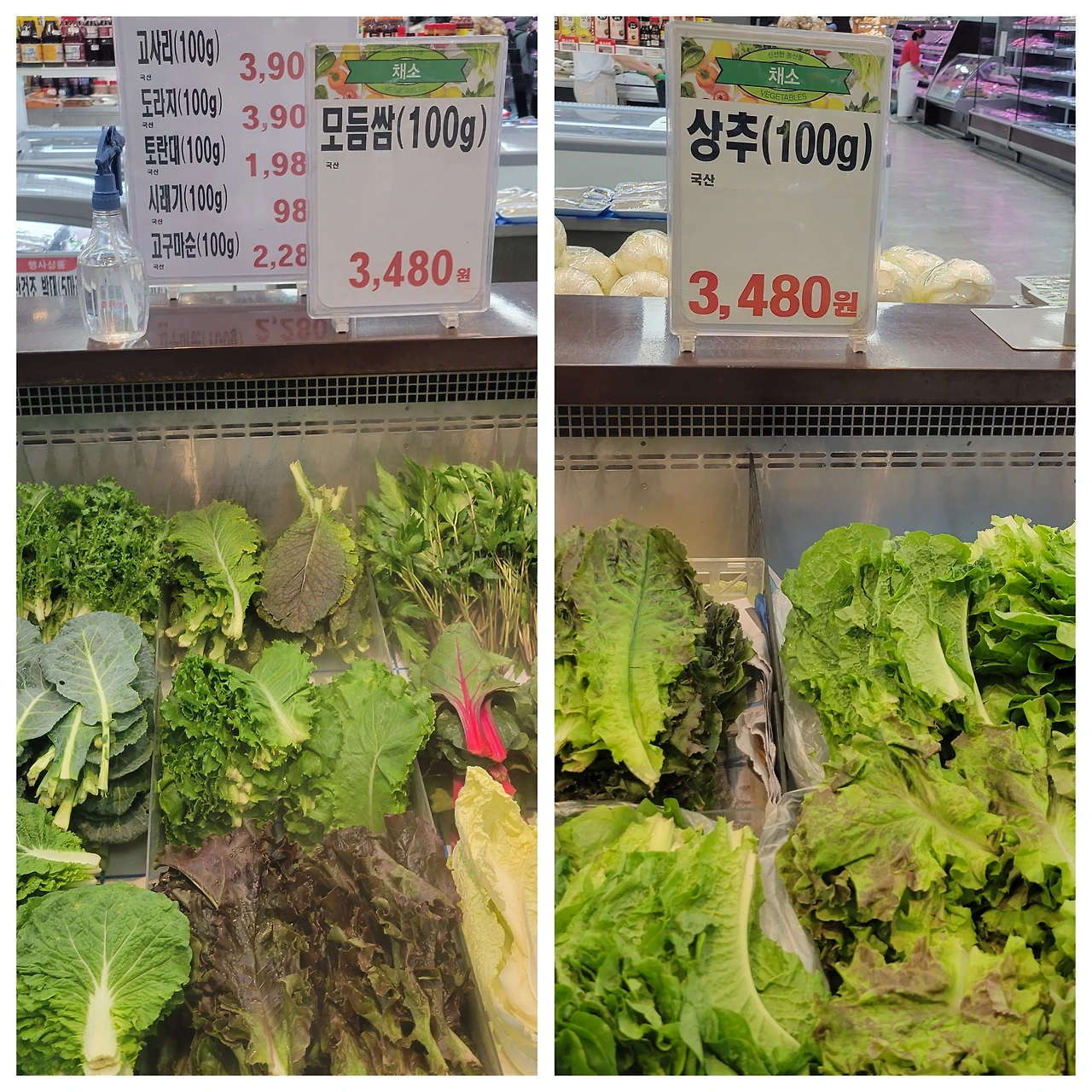 모듬 쌈과 상추 몸값이 비싸다보 냉장 진열대에 보관되어 신선도를 유지시키고 있다.