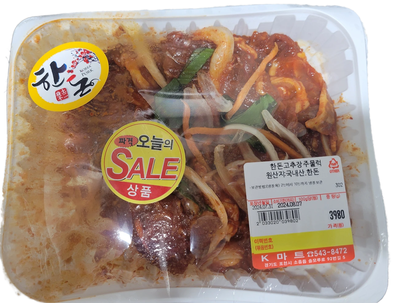 마트에는 오늘의 특가 세일 상품으로 한팩에 3.980원이라는 저렴한 가격에 고추장 주물럭이 올라와 있다. 장바구니에 한팩을 담았다. 먹는 양이 많지 않아302g 한팩으로 2식 정도는 충분히 소화해 낼 수 있을 양이다.