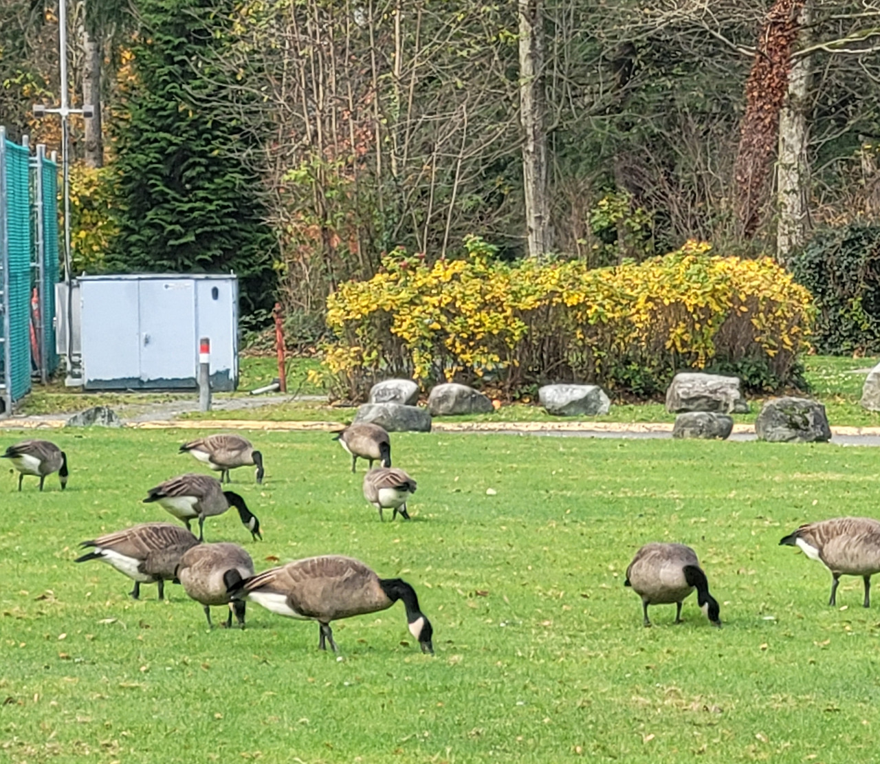 공원입구를 들어서는 순간, 제일 먼저 구스가 공원 잔디밭에서 한가로이 풀을 뜯고 있는 모습이 목격되었다. 계절은겨울로 향해 가고 있는데 공원 잔디는 계절감각을 잊고 있다. 겨울철에는 캐나다산 구스 자켓이유명하다. 가격도 비싸고 모양은 사실상 세련미나 정교함은 없다. 투박하다는 느낌이 지배적이다. 어쩌면, 구스자켓만이 지니고 있는 매력일 수도 있다.자켓은 보온성이 뛰어난 것도 있지만 값비싼 유명 브랜드라는 인식과 함께 주변인의 이목을 집중해 가려는 의도가 이유가 되어 입는 사람도 있다.