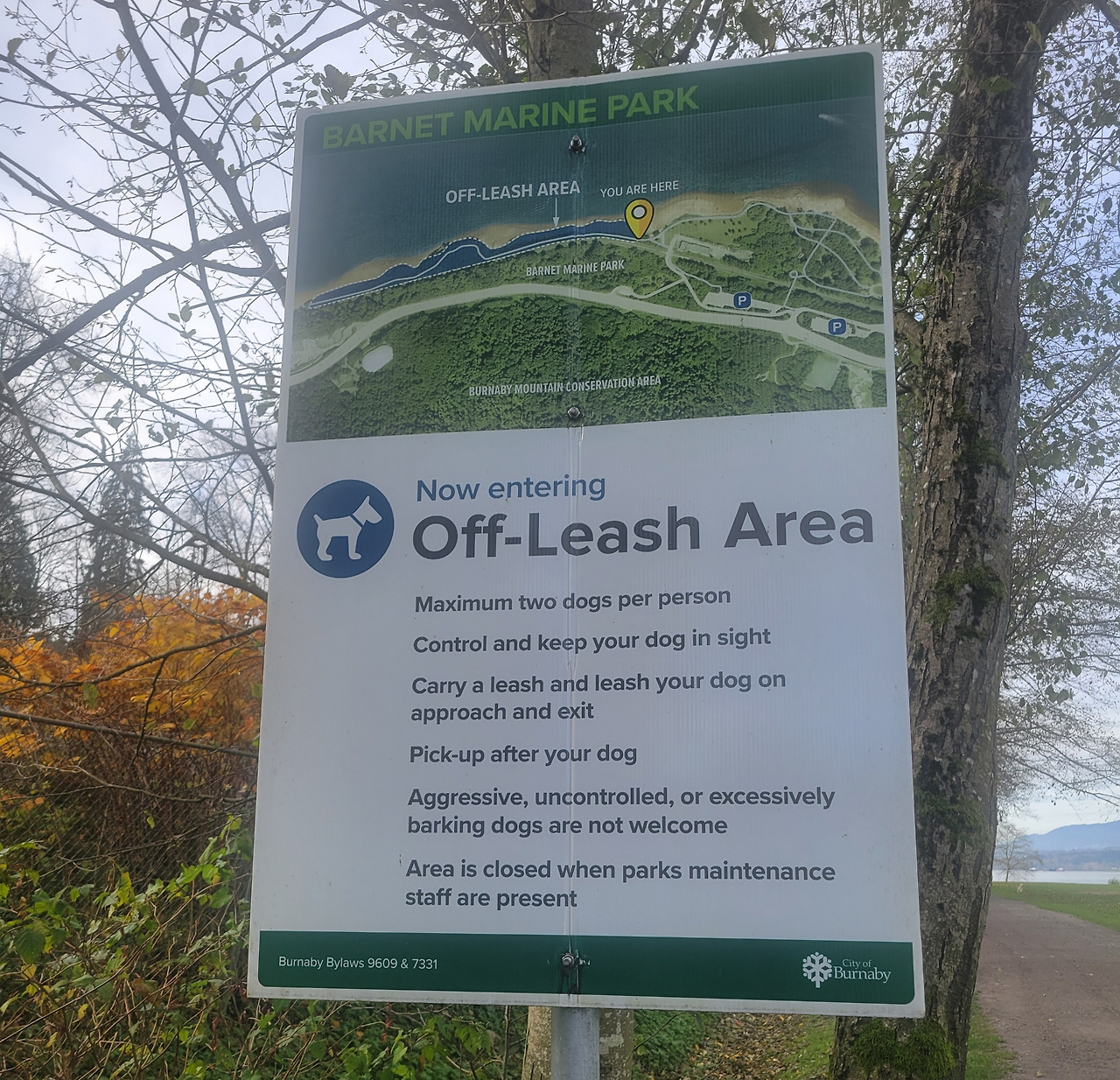 표지판을 경계로 개공원이라는 이야기이다. 밴쿠버에는 개들이 자유롭게 뛰어놀 수 있는 개공원이 별도로 조성되어 있다. 사람과 대등한 권리를 부여 해준 셈이다.