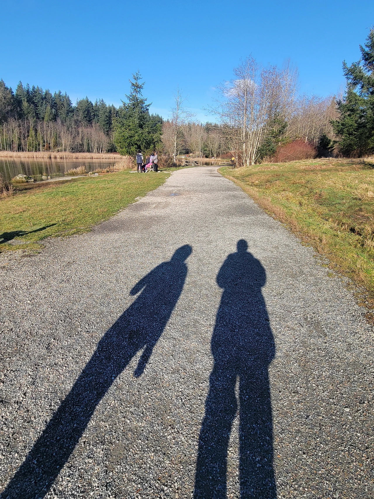 호수를 산책할 때면 우리 부부는 호수 주변을 보통 3번 정도 돌고 집으로 돌아간다. 그렇게 걸은 도보는 약 10,000보 정도 된다. 오늘은 오랜만에 그림자를 마주했다. 얼마나 오랜만인지, 기억 속에서도 그림자는 잊혀 있었다. 오늘, 우리 부부의 그림자가 땅 위에 길게 드리워졌다. 햇살이 선물한, 소중한 순간의 흔적이다.