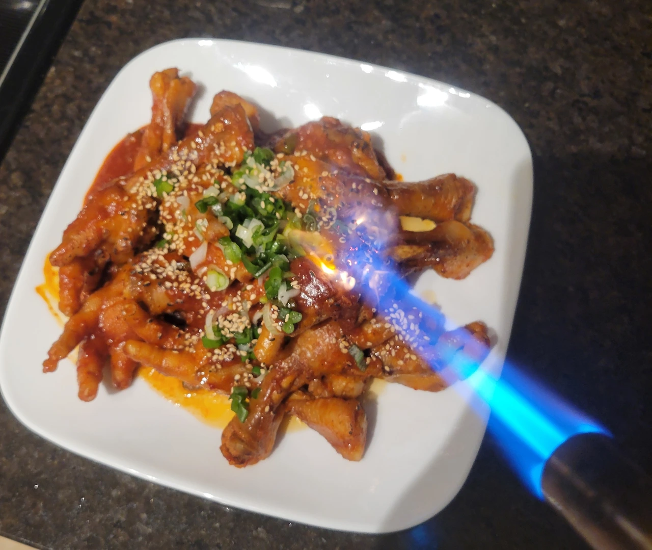 한 시간에 걸쳐 닭발을 완성해 놓았다. 원래 계획은 그릇에 옮겨 담고 토치를 해서 불맛을 낸 후, 깨와 파를 토핑 하는 것이었는데, 순간적으로 순서가 뒤바뀌어 버렸다. 어쩔 수 없이 토핑 된 부분을 피해 가며 조심스럽게 토치를 대어 불맛을 입혔다. 그렇게 완성된 닭발을 바라보니, 묘한 감정이 밀려왔다.