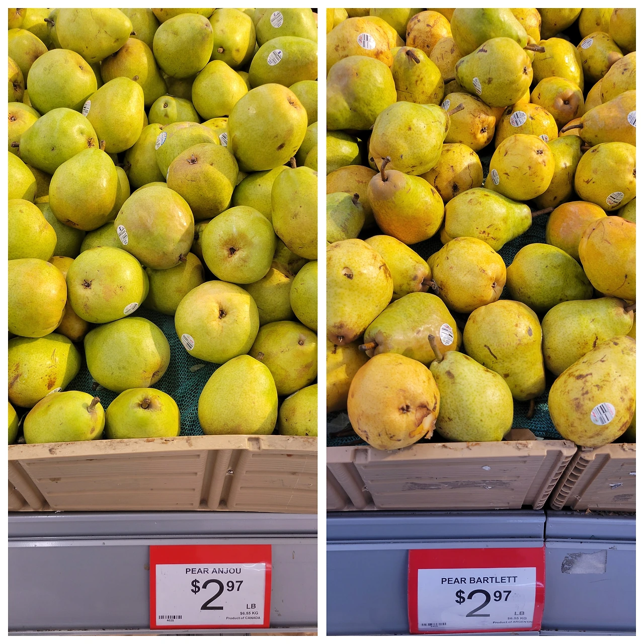 서양배(Western Pear)는 주로 길쭉한 형태에 부드러운 식감을 가지고 있으며, 시간이 지나면서 자연스럽게 숙성되어 더 달콤하고 촉촉한 맛을 낸다. 반면, 한국산 신고배는 처음부터 아삭하고 과즙이 풍부해 식감 면에서 차이가 크다. 아마도 이런 점 때문에 한국 배에 익숙한 사람들은 캐나다 배를 보고 다소 생소하게 느낄지도 모른다.
