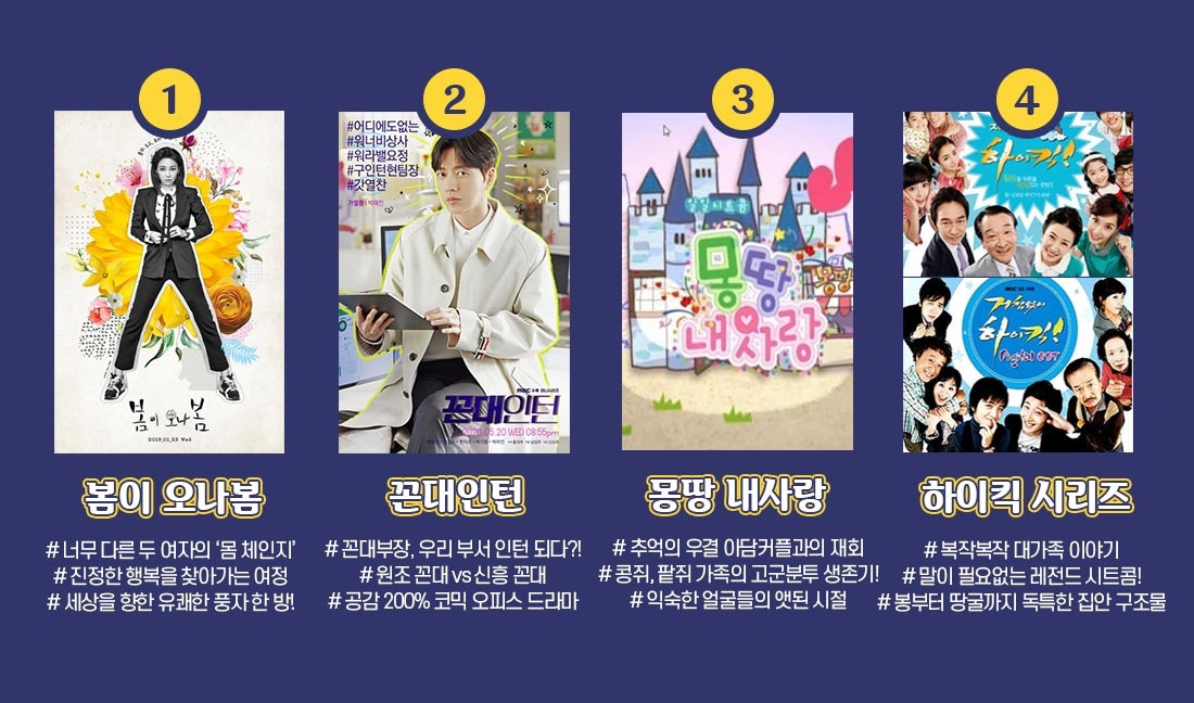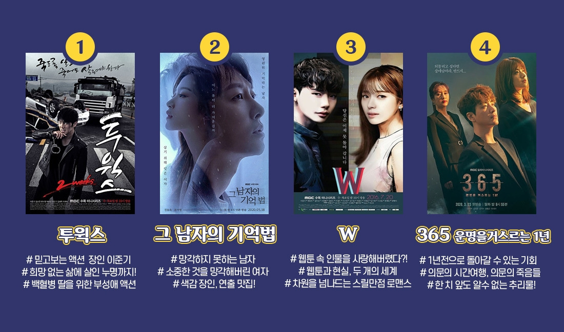 코로나가 길어지며 주로 집에서 시간을 보내는 요즘, 코로나 블루를 이겨내기에 드라마 정주행만 한 게 없죠? 그래서 준비한 MBC 드라마 정주행 가이드북! 작성자의 사심을 듬~뿍 담은 분야별 넘버원 드라마의 영업글과, 각 추천작들의 포인트 해시태그를 통해 정주행 드라마를 결정해 보아요!