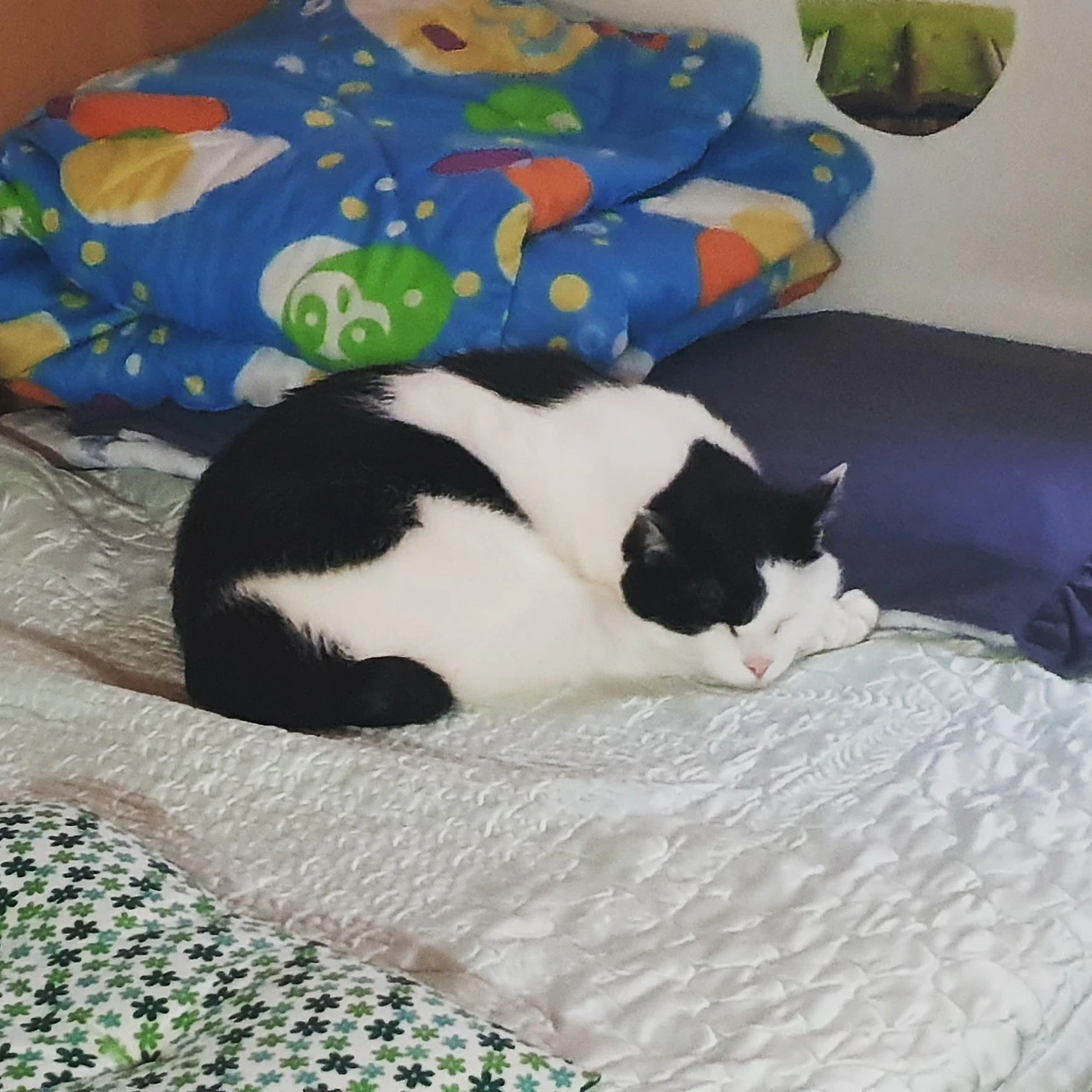 그러다가 이 사진을 봤는데, 마치 네가 알록달록한 세계에 실수로 떨어져서 번지는 먹물 한 방울 같은 거야. 만날 수 없는 두 세계의 충돌인거지. 팀버튼의 영화 속 변상벽의 고양이처럼. 그렇지만 뭔가 의도적으로 그려낸 듯한 너의 검고 흰 곡선들은 필름을 화선지로 바꾸듯 장르마저 바꿀 것 같아. 샹치와 텐 링즈의 전설을 멜로드라마로 만들어버린 양조위처럼. 이미 여기서 벌써 기절(좋아서)하는데 심지어 사진 속 네가 천천히 눈을 뜬다면? 상상해 봤어. 하얀 화선지 위에 떨어진 먹물이 삽시간에 번지듯 할 것 같고, 뭔가 갑자기 암전이 되면서(세상의 종말) 누나의 심장은 (너의 귀여움으로) 터질 것만 같아. 그러다 다시 갑자기 눈을 깜빡(네 눈이 아니라 내 눈을)이고 나면, 그냥 알록달록한 시골 이불들 사이에서 잠을 자고 있는 통통한 젖소 고양이가 보이는 사진인데.