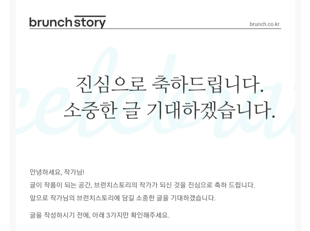 10편의 글을 써보니 계속 글을 쓰고 싶었다. 사람들에게 나의 이야기를 쏟아내고 나면 후련해지듯, 나 자신에게 글로 마음을 쏟아내고 나면 의외로 나의 상처도 담담해지더라. 이게 글쓰기의 매력인 것 같다. 글을 쓰려면 글을 쓸 창구가 필요했다. 그래서 10편의 글을 다듬어 생각만 하던 '브런치'에 도전했는데, 혼자서는 엄두도 못 냈던 것이 역시 함께 하니 되더라. 진심으로 쓴 친정엄마와의 이야기, 남편과의 이야기로 브런치에 합격했다. 합격 메일을 보는 순간! 아내, 엄마가 아닌 원래의 '나'로 이루어낸 오래간만의 성취라는 생각이 들어 기분이 너무 벅찼다.