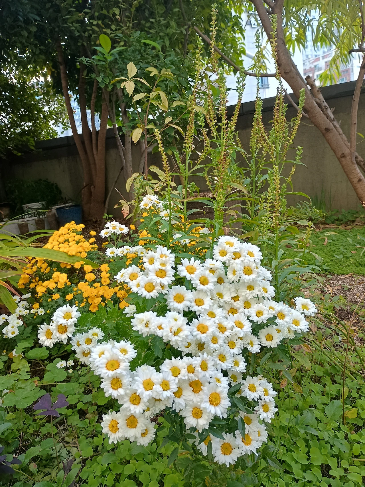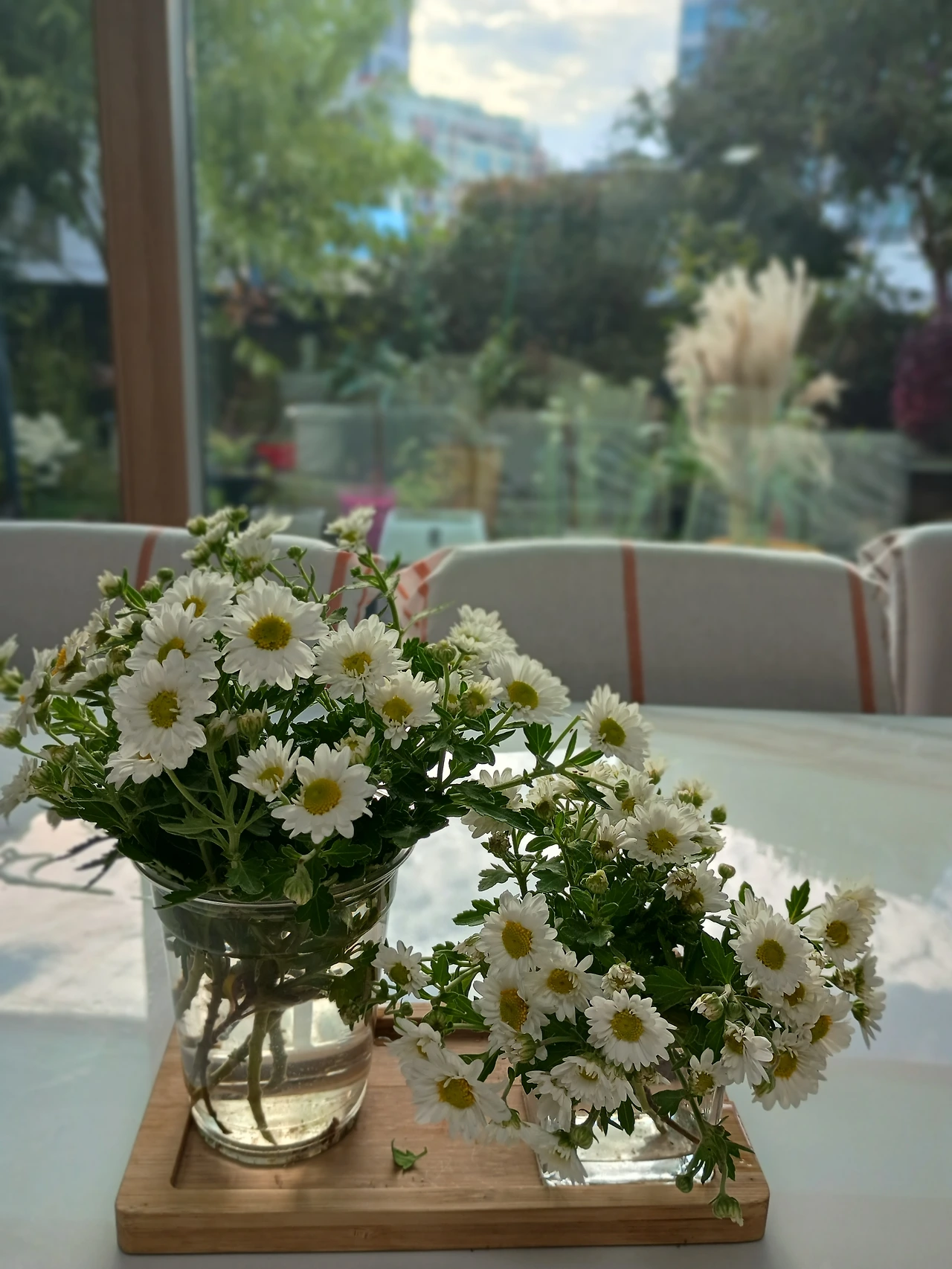 집에 와서 작은 잔에 국화꽃 몇 송이라도 꺾어 놓으려고 했다. 그런 마음을 아는지 남편이 테라스에서 풀을 뽑다가 국화꽃 한뭉큼이 꺾였다. 나는 아직 피지 않은 꽃망울이 안타까워 작게 잘라 꽂았다. 시간이 지나면서 국화꽃이 피어나는 것을 식탁에서도 테라스에서도 보고 있다.
