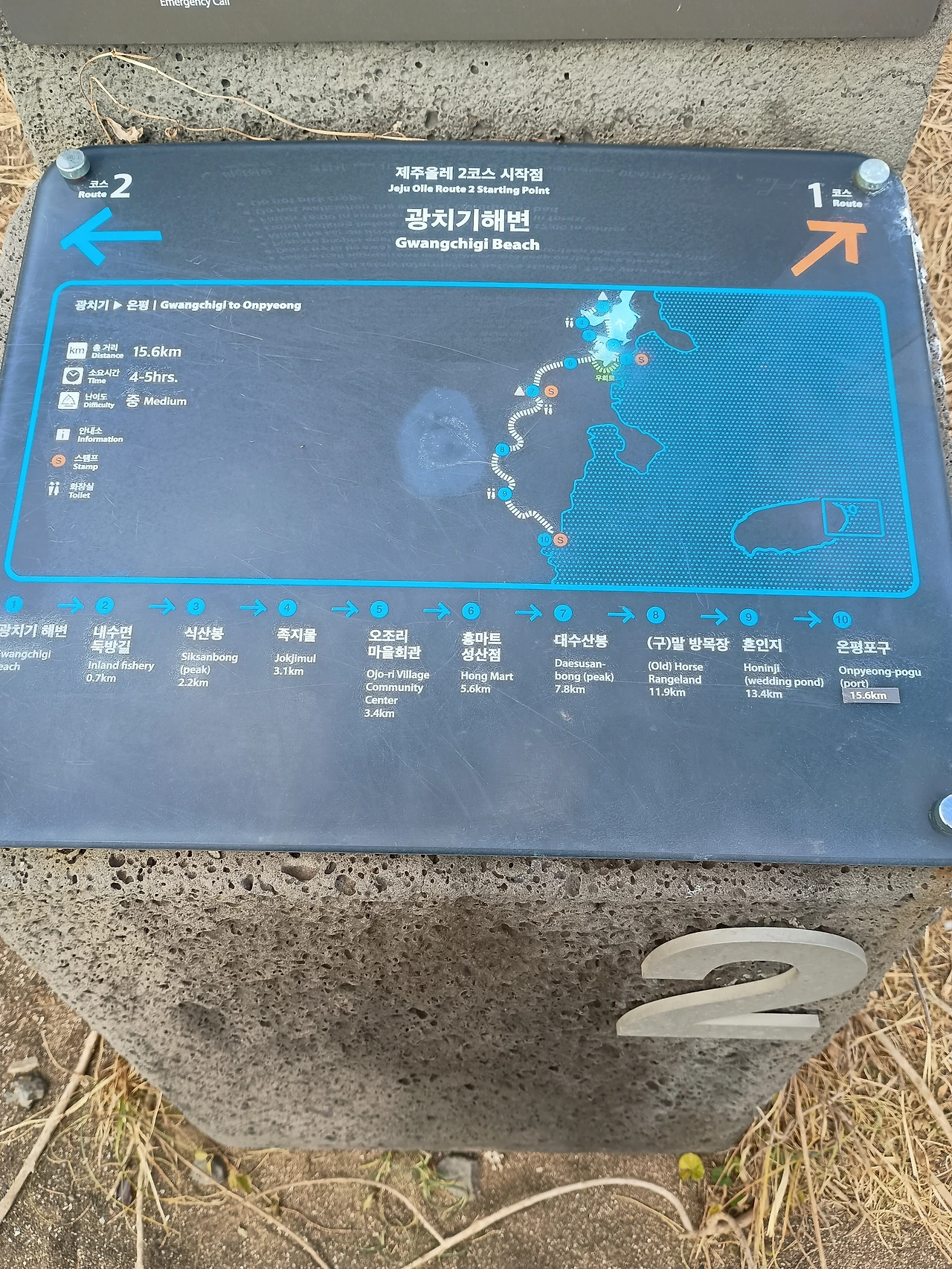 우리는 12시부터 걷기 시작해서 광치기 해변에서 1코스가 끝나서 근처 차편을 검색해 보니 해변을 따라 도로변 버스정류장이 있었다. 우리는 그 버스 정류장 근처 공용 주차장에 공동 화장실에 들렀다. 우리는 10~20분 간격으로 오는 210번을 다시 타고 시내로 돌아왔다.