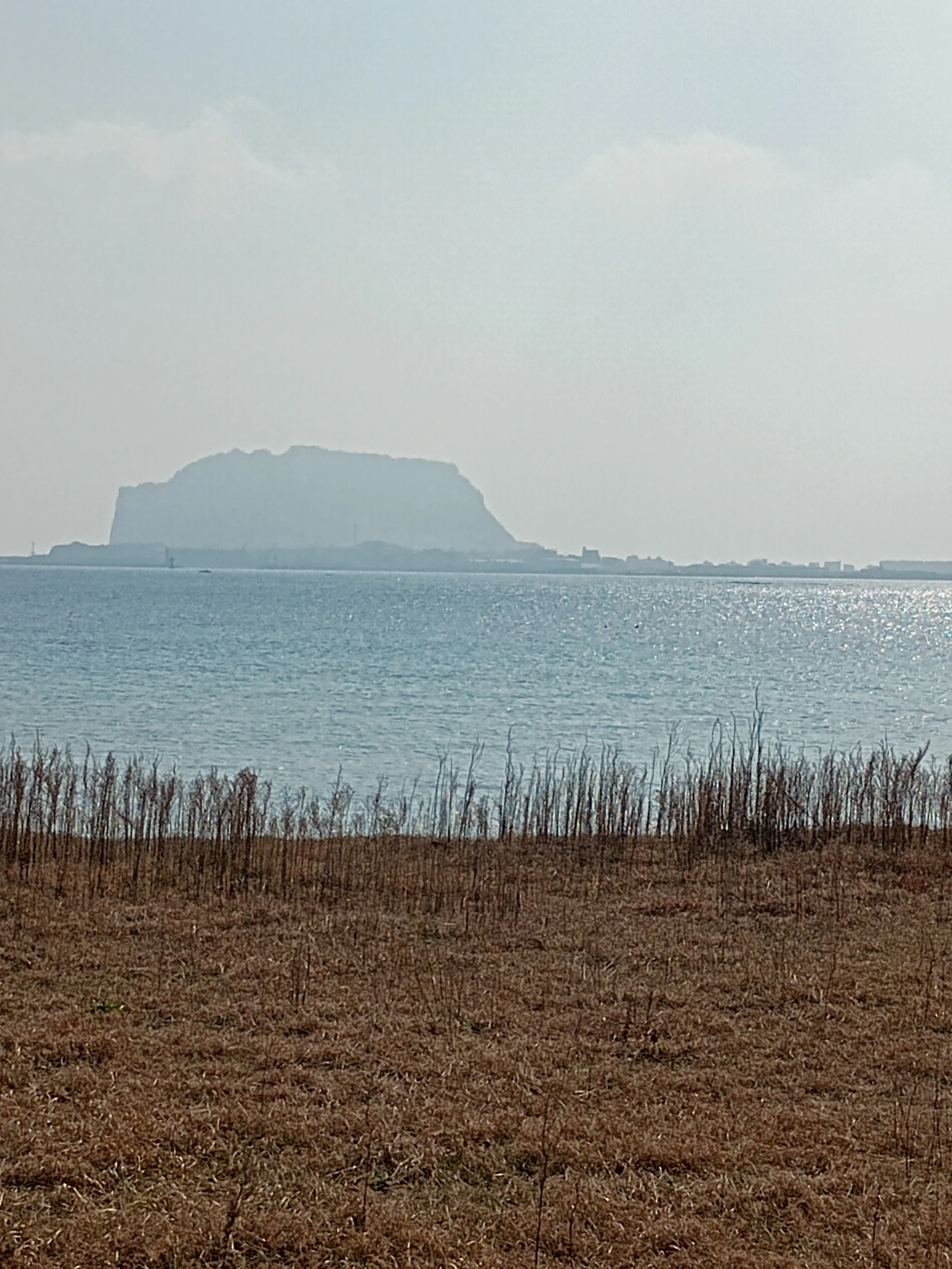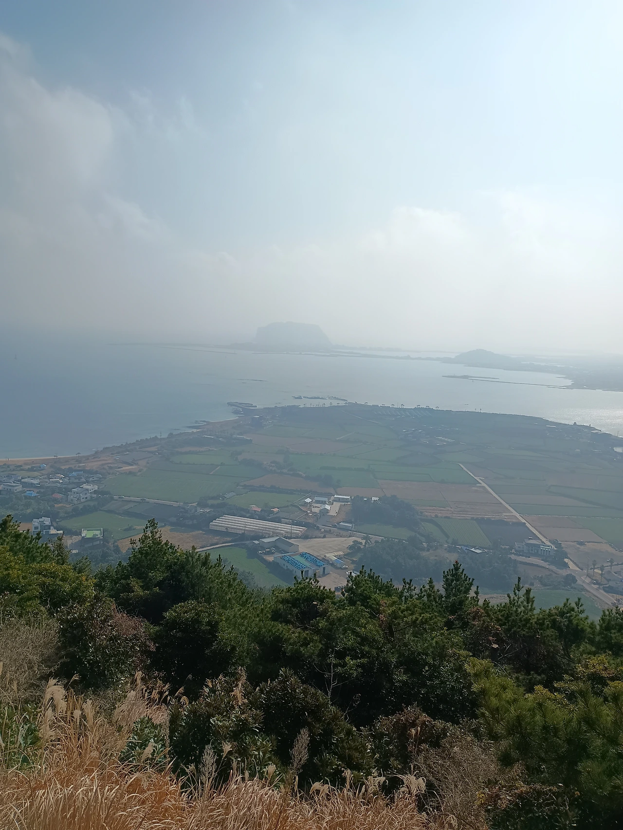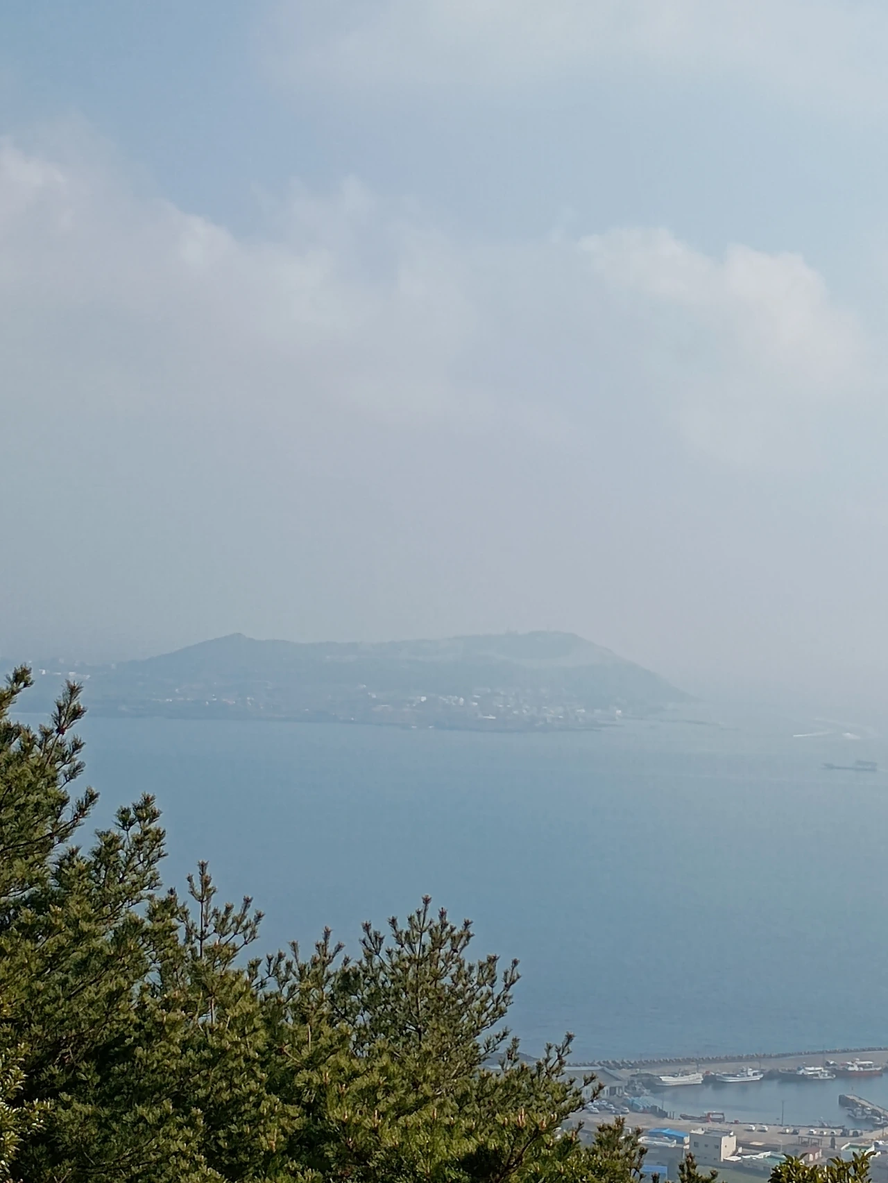 300m쯤 올라가니 성산포와 1-1코스인 우도가 한눈에 들어왔다. 미세먼지 때문인지 뿌였지만 화창한 것만으로도 나는 기분이 최고였다. 오름을 올라오는데 봄이 온 것 같았다. 오름을 갈 때는 무조건 반팔과 가벼운 옷차림을 해야겠다고 하며 올라갔다. 올라오니 마음이 뻥 뚫린 것 같이 시원했다.
