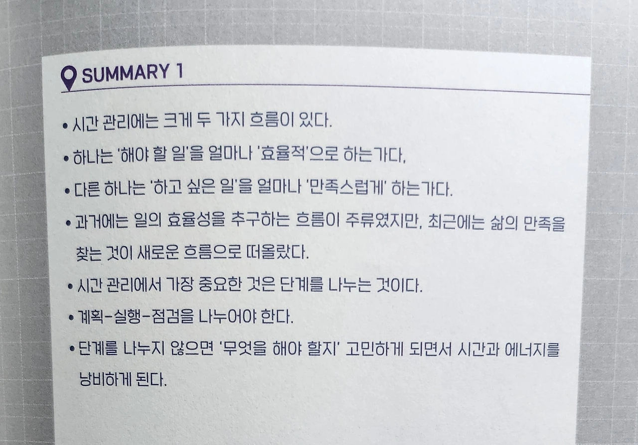 시간 관리는 크게 두 가지가 있다고 한다. 해야 하는 일은 효율적으로, 하고 싶은 일은 만족스럽게 만들기 위해서라고 했다. 하지만 효율적으로 일해서 만족스러운 일을 만들기 위해서 시간을 관리하는 것 같다. 그리고 계획하지 않으면 우리 뇌가 무엇을 할지를 고민하면서 에너지를 쓴다고 했다. 그래서 우리는 가끔 에너지를 쓰고 싶지 않아서 생각하지 않고 사는 대로 살 때가 많다. 그렇게 편하게 살다 보면 그 삶이 그렇게 행복하지 않다는 것을 느낄 때가 많다. 그래서 내 시간을 관리해서 내가 원하는 멋진 인생을 살고 싶은 것 같다.