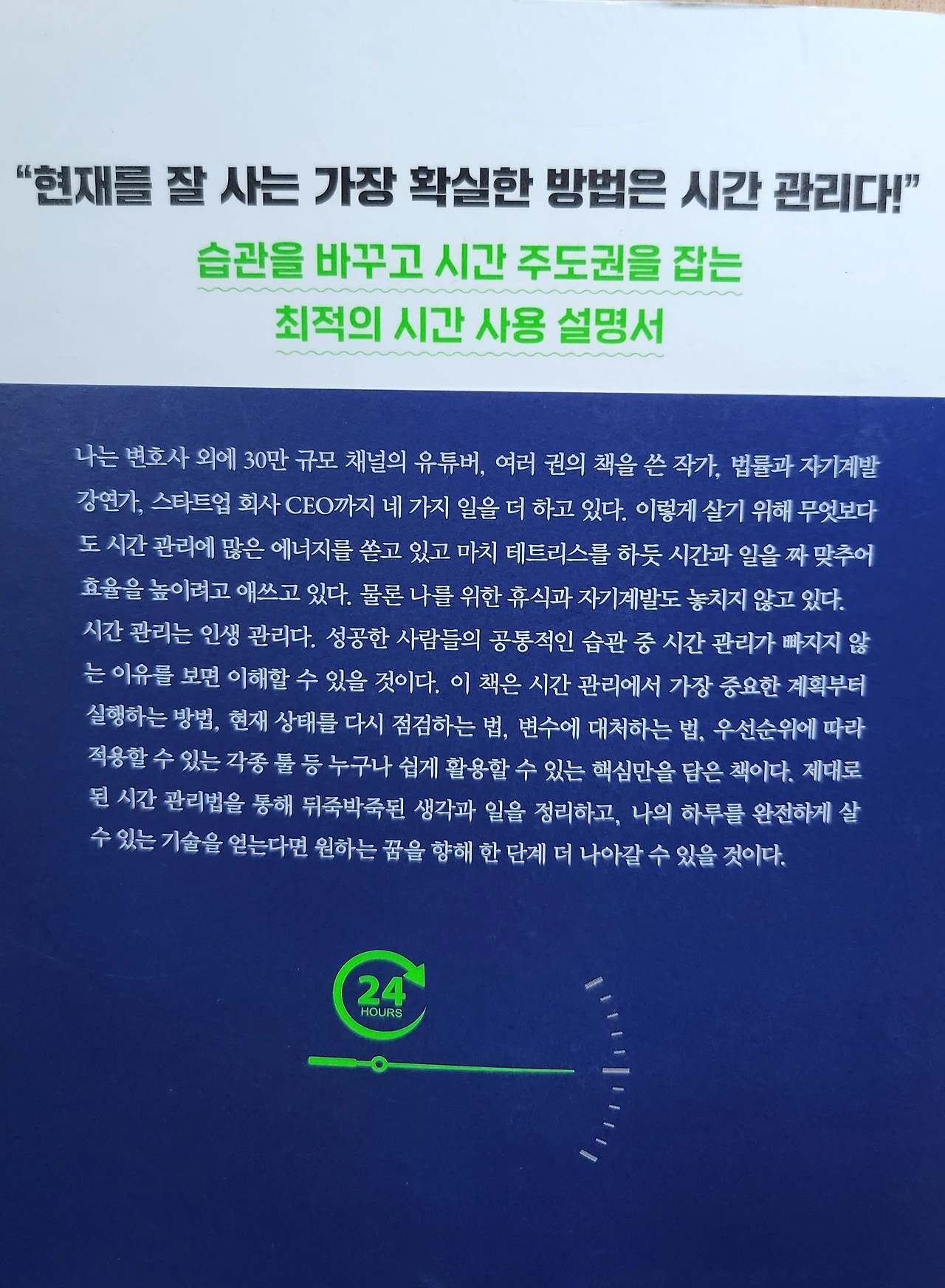 책을 읽기 전에 이렇게 앞뒤 표지에 책이 말하고 싶은 내용이다"라고 했다. 제목에서 말하는 것처럼 계획, 실행, 점검 3단계로 성공적인 시간 관리하는 사람이 되라고 말하고 있다. "현재를 잘 사는 가장 확실한 방법은 시간 관리다!"라고 말하고 습관을 바꾸고 시간 주도권을 잡는 최적의 시간 사용 설명서가 있는 책이었다. 한마디로 말해서 시간 관리는 인생 관리라고 저자는 말하고 있다.