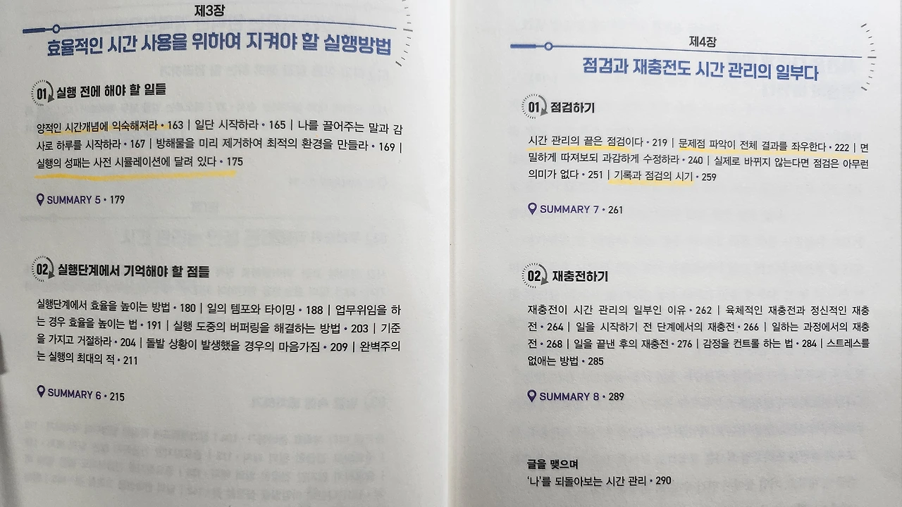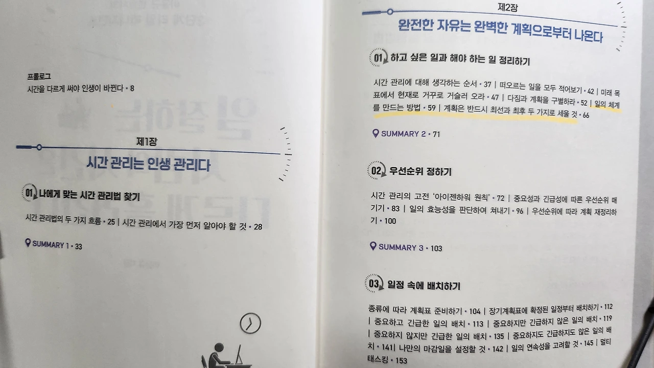 표지를 읽었다면 그다음에 목차를 읽으면서 저자가 말하는 말하고 싶어 하는 정답을 찾아가 보라고 했다. 그래서 처음에 읽을 때는 내가 알고 싶고 궁금한 목차에 줄을 긋고 안에 챕터를 읽어 보았다. 그래도 나는 저자가 말하는 시간관리에 대해서 무슨 말을 하는지 이해가 잘 되지 않아 처음부터 찬찬히 읽어 보았다.