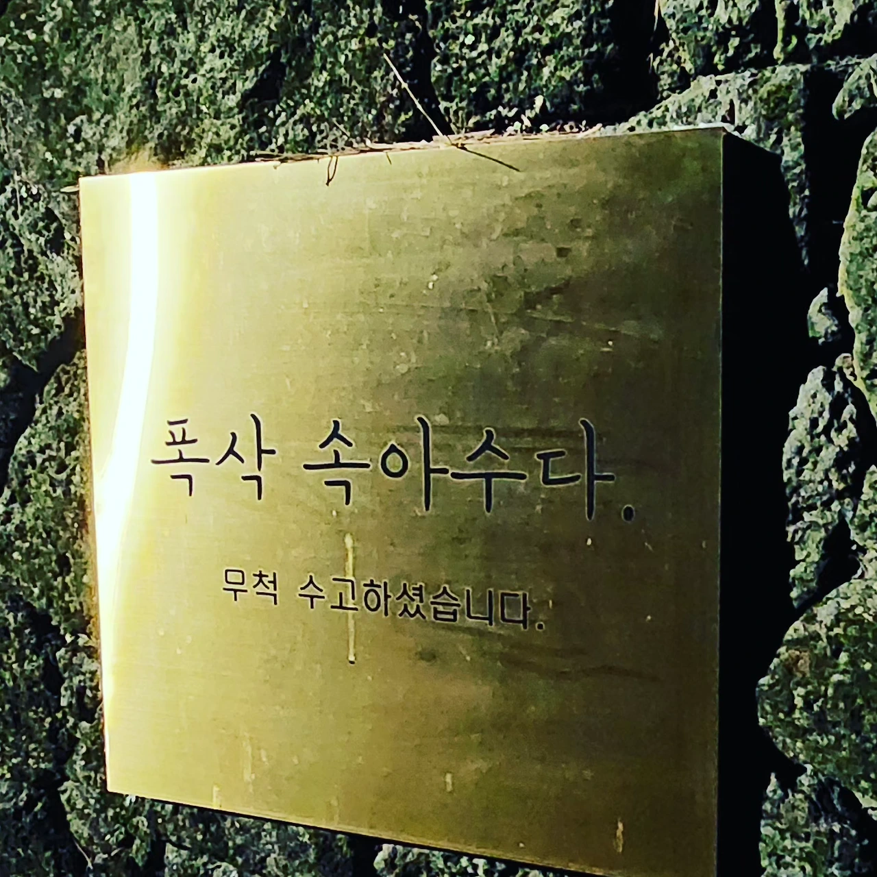 추석 명절날 예전보다 일찍 술자리가 끝나서 나는 남편과 시댁 서귀포 천지연 폭포로 산책을 나가게 되었다. 추석 보름달도 보고 천지연 폭포를 돌아 집으로 가는 언덕 벽에 제주도 사투리 글귀가 쓰여있었다. 나는 그중에서 이 말이 왜, 다가왔을까?