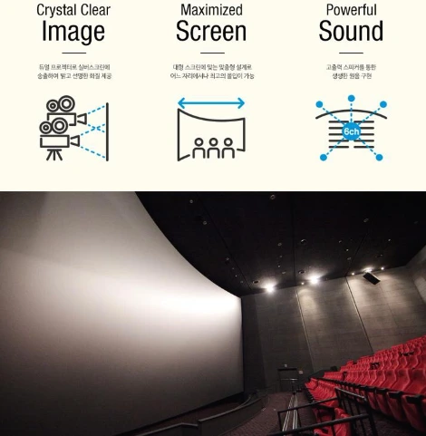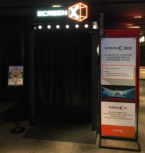 - 기본이 되는 앞 쪽은 물론 좌우에도 스크린이 연결되어 몰입하게 되는 상영관(ScreenX)