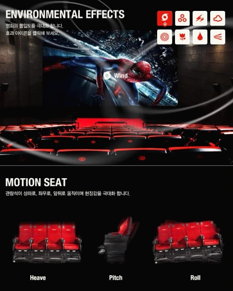 - 영화 내용과 상황에 맞추어 실제 관객이 효과를 느낄 수 있게 제공하는 상영관(4DX)