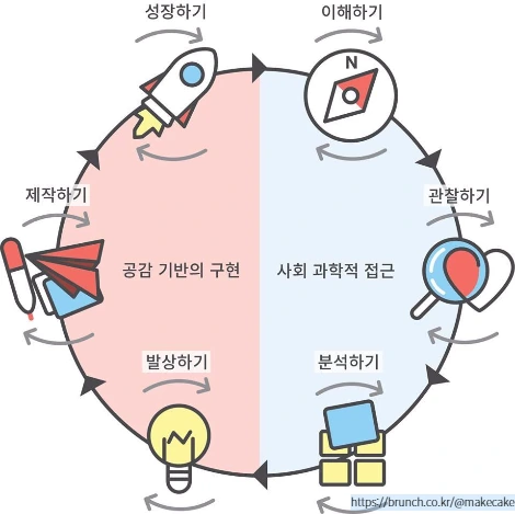 일하는 접근 방식으로 '디자인 씽킹'이라는 마인드셋을 어떻게 이해해야 하며, 이를 '서비스 디자인'이라는 실무 프로세스에 어떻게 적용시키고 운영할 것인지를 처음부터 다시 학습한다는 관점으로 다룹니다.