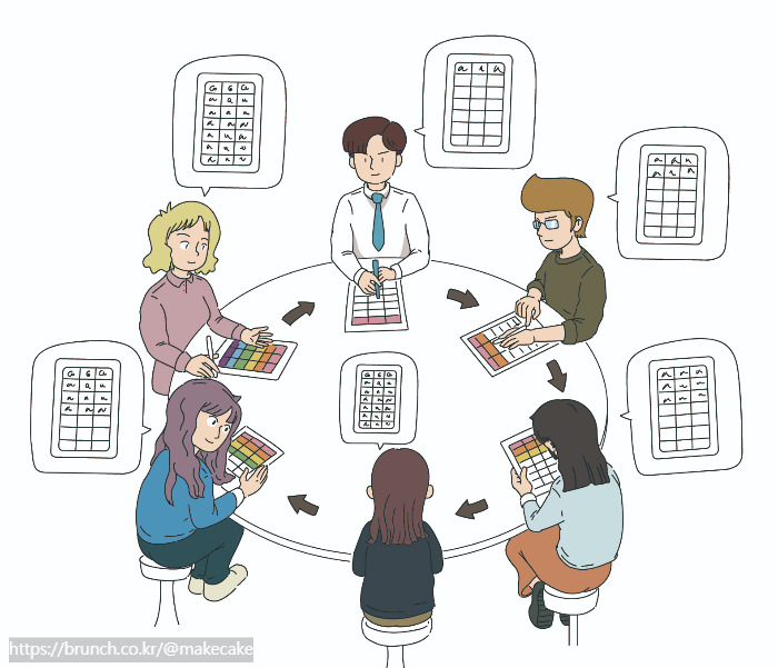 그리고 아이디어를 생성하고 발전시키는 여러 방법 중 익숙한 활동에서 벗어나 봅시다. 흔히 아이디어를 생성한다고 하면 자연스럽게 브레인스토밍을 떠올립니다. 브레인스토밍은 좋은 방법이며 그 활동을 무조건 벗어나야 한다는 내용도 아닙니다. 그보다는 목적과 주제에 따라 더 효과적이고 적절한 방법은 무엇인지 점검해 보고 필요하다면 새로운 방법의 시도를 검토해 볼 수 있다는 것입니다.