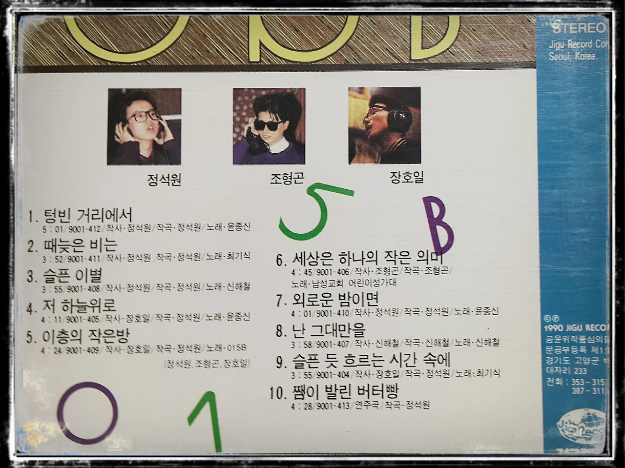 덧붙인 얘기 하나를 하면 공일오비는 3집 이전까진 TV 매체를 통해 보기 힘든 팀이었습니다. 그 와중에 공일오비 1집 초기 CD 뒷면 멤버 사진 아래에 이름은 정석원,조형곤,장호일으로 되어있지만 실제론 조형곤,장호일,정석원이라 혼란을 가져오기도했죠. 오랫만에 당시 CD를 꺼내 인증샷을 붙였습니다.