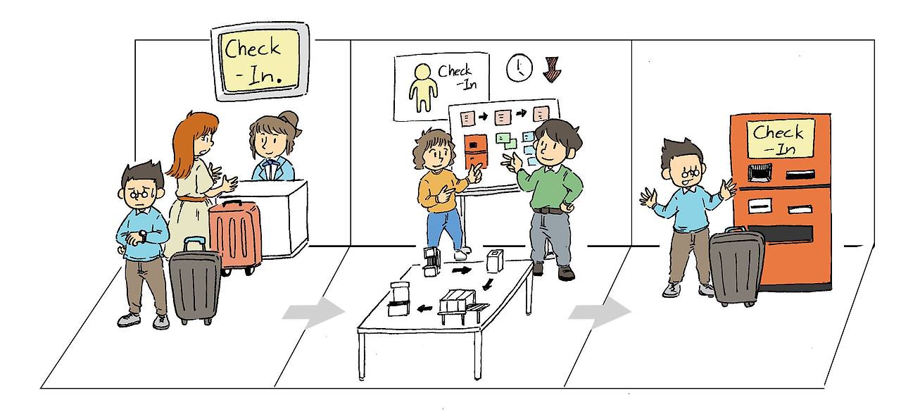실제로 서비스 디자인 씽킹에서 이야기하는 디자인 원칙은 어떤 과정을 필요로 할까요. 공항에서의 사례는 새롭지 않을 수 있지만 여전히 엔진Engine 등에서 자신의 Work을 소개할 때 대표 사례로 앞 단에 두고 있습니다. 그만큼 많은 사람들이 비슷한 상황을 겪어 몰입하기도 좋고 실제 프로세스에서 어떤 과정을 거치게 될지 이해하기도 더 쉽죠. 공항에서의 탑승 수속 과정을 생각해보죠.