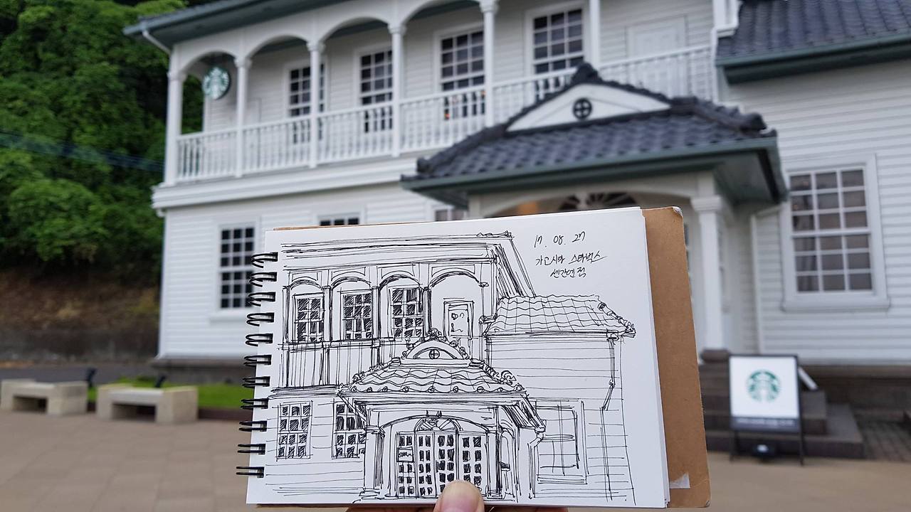 인상적이었던 일본 건물을 다룬 두 스케치. 역은 그렇지만 다음은 놀랍게도 스타벅스.