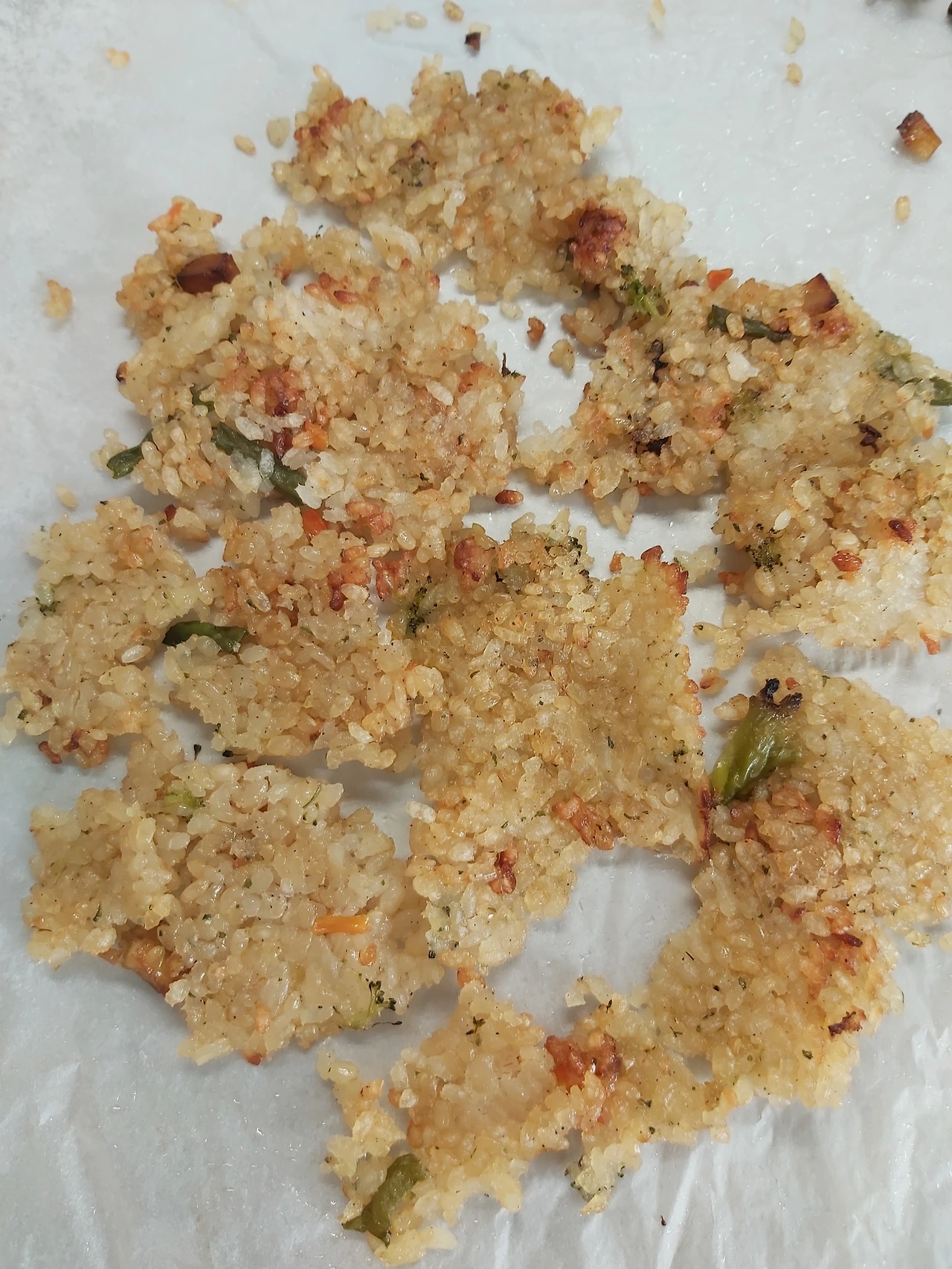 남은 볶음밥을 얇게 눌러 펴서 기름을 두르고 오븐에 넣었더니 바삭하게 구워졌다.