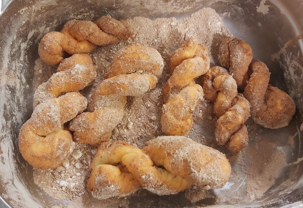 설탕은 덜 정제된 굵은 설탕밖에 없어서 분당과 계피를 묻혀서. 역시 인기 폭발이었다~