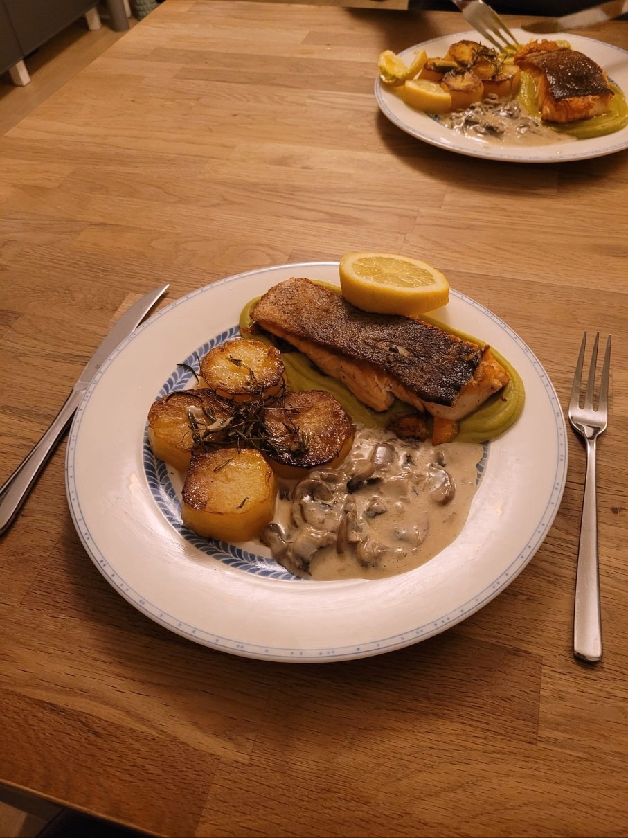 연어구이에 완두콩퓨레, 오븐감자와 버섯소스...