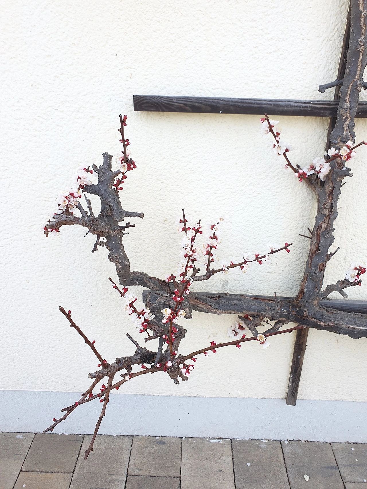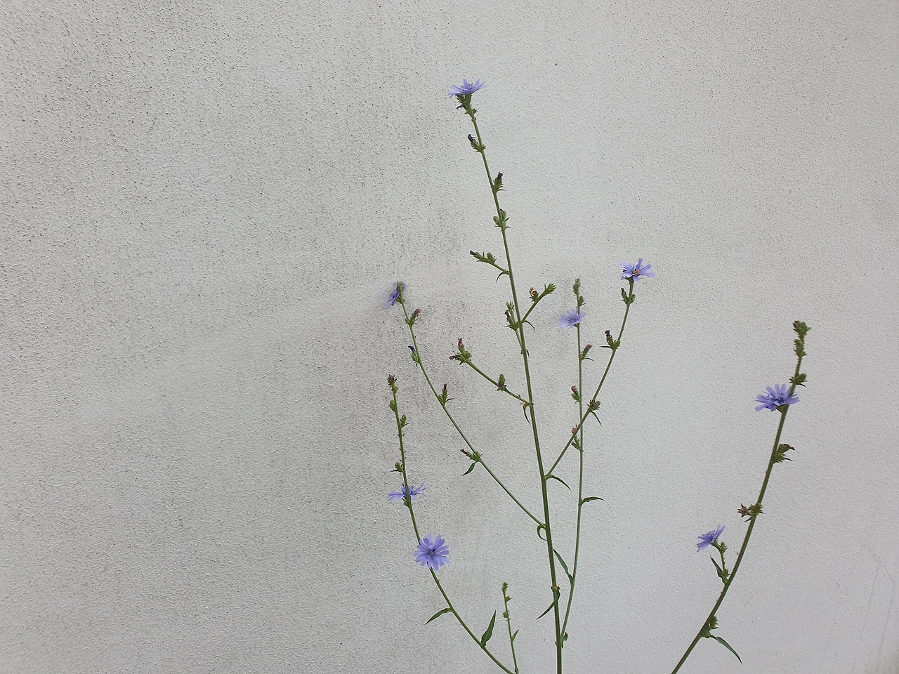 어느 집 담장의 꽃. 하얀 벽에 있는 꽃이 그림 같다.
