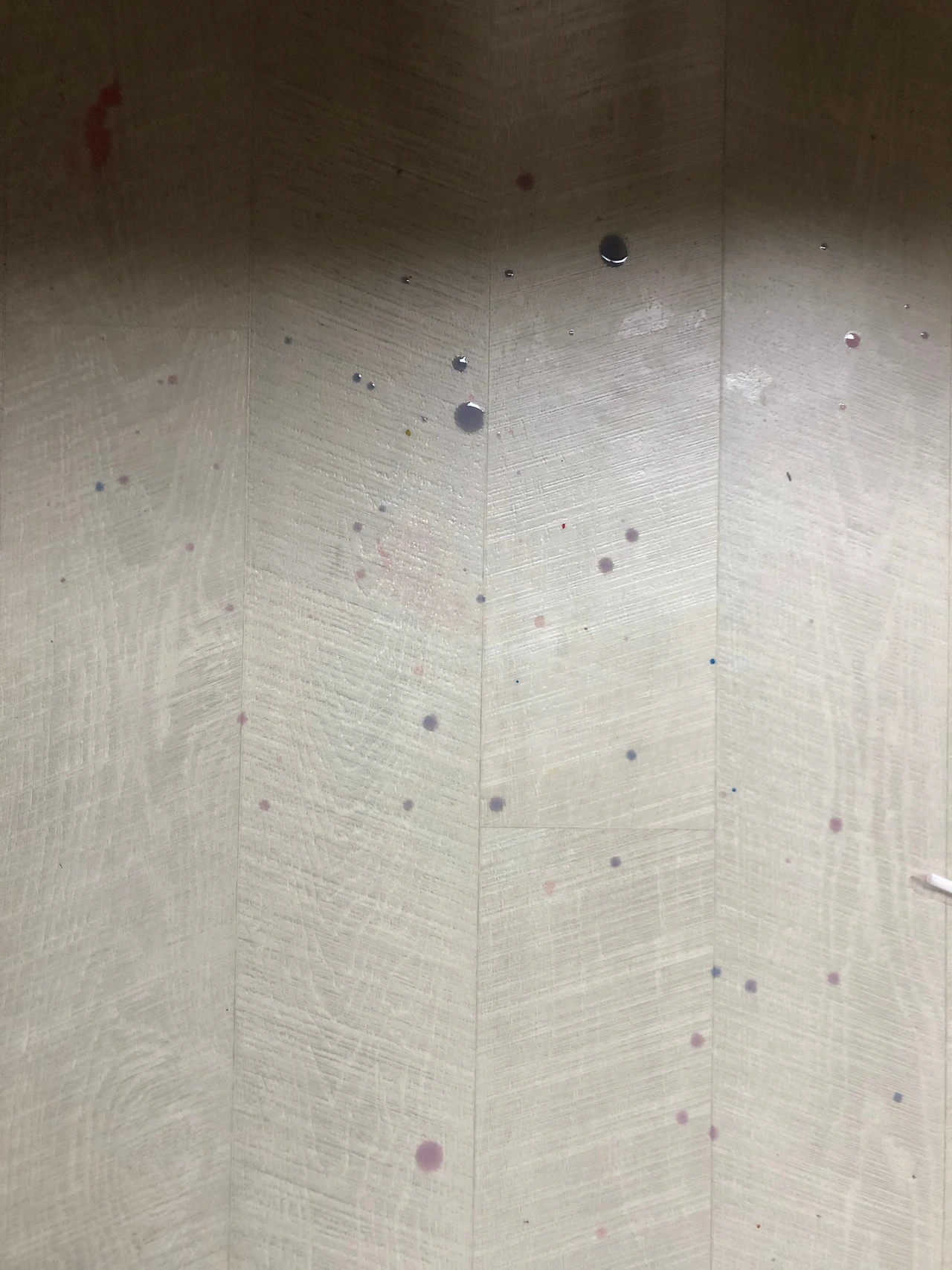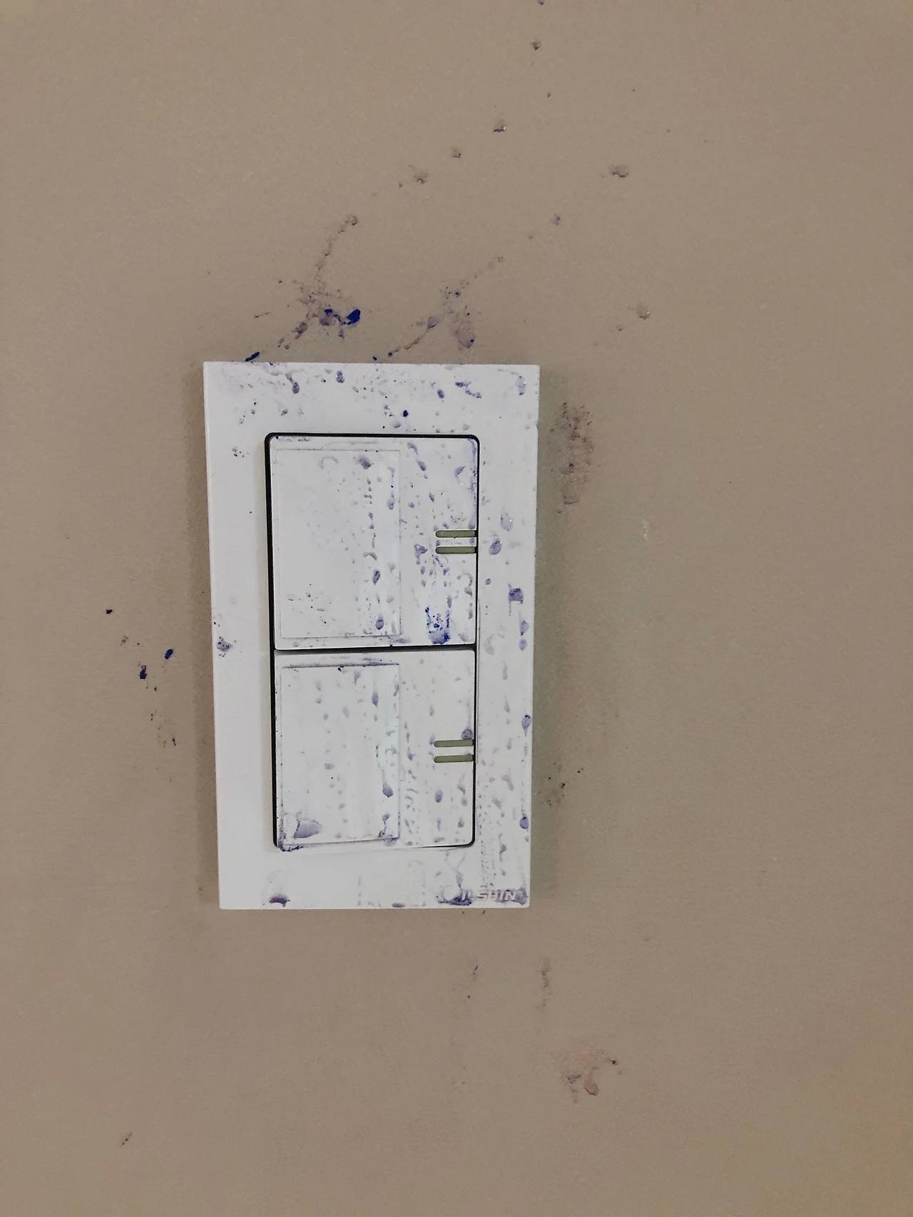 며칠 전 화장실에 들어가려고 스위치에 손을 대려는 순간 나는 또 한 번 소스라치게 놀랐다. 그리고 내 눈을 의심했다. 도대체 이건 무슨 흔적이지? 가만 생각해보니 좀 전에 물감놀이를 한 아이가 손 닦고 오겠다고 하더니 이런 추상화를 또 만들어 놓은 것이다!