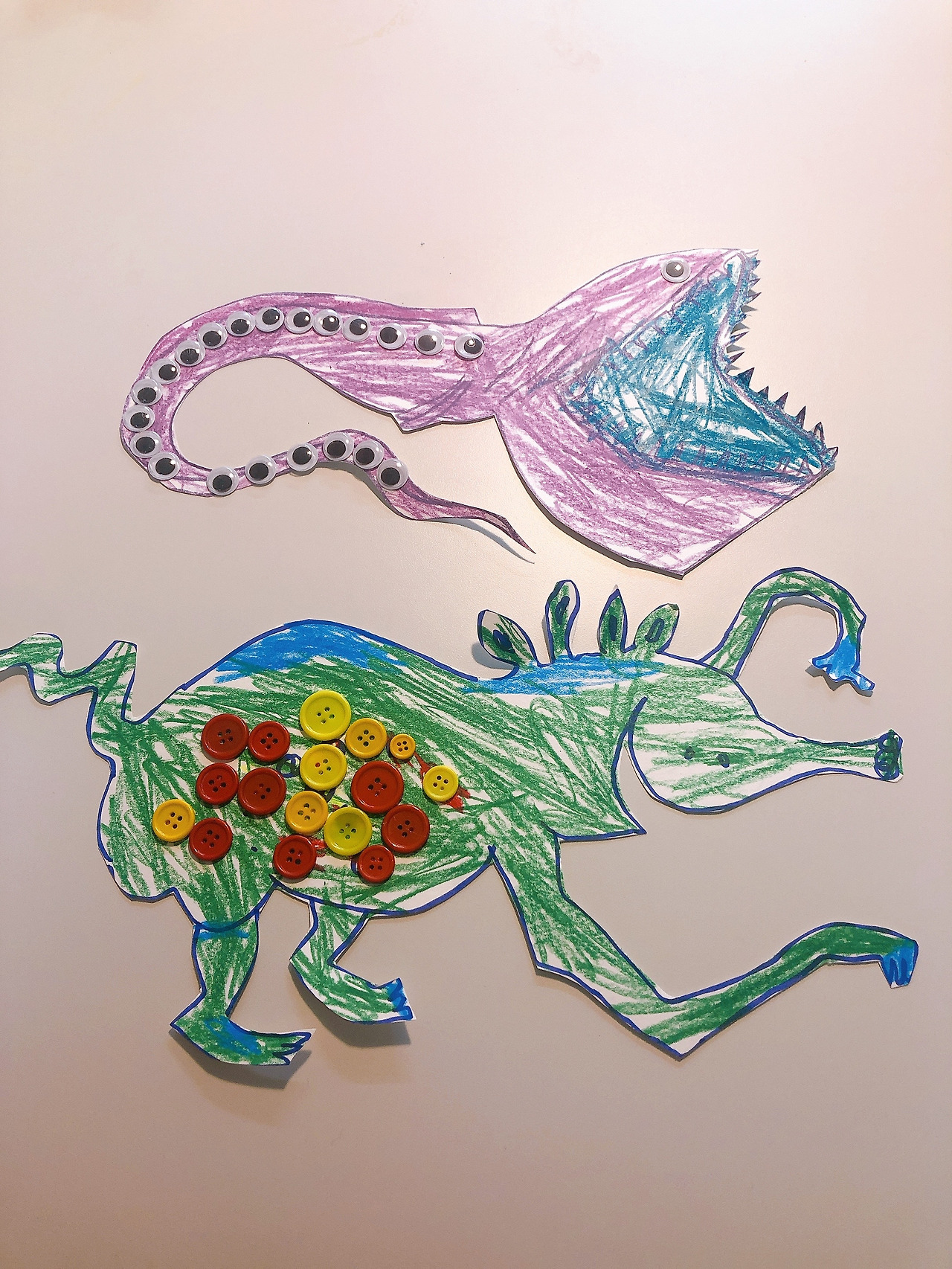 클래식 라디오 83.1에서 나오는 연주곡 2곡을 들으며 <배꼽괴물>과 <큰입장어>를 그려줌. 아이가 색칠을 하다가 갑자기 라디오를 막 두들기고 만져서 주파수가 맞춰지지 않음. 아무래도 망가진 것 같음. 급 짜증났으나 참음. <배꼽괴물>그림의 배꼽엔 단추를 붙여주고, <큰입장어> 그림엔 눈알을 붙여줌.